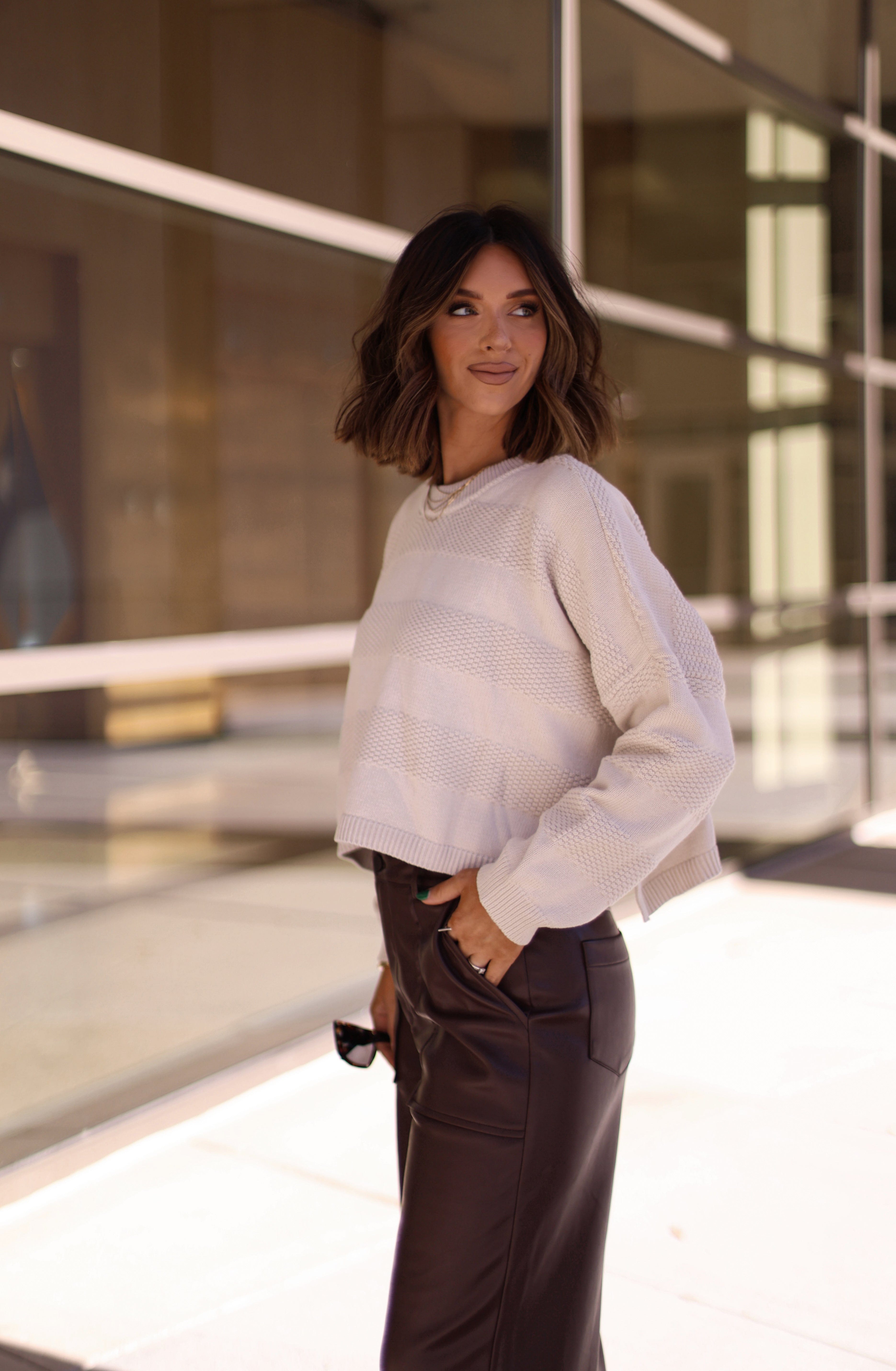 This Act Natural Pullover is made from 100% cotton, ensuring comfort and breathability for everyday wear. The cropped design and loose fit provide a trendy and relaxed look, while the subtle stripe detail adds a touch of style. Stay effortlessly cool and comfortable in this must-have pullover.