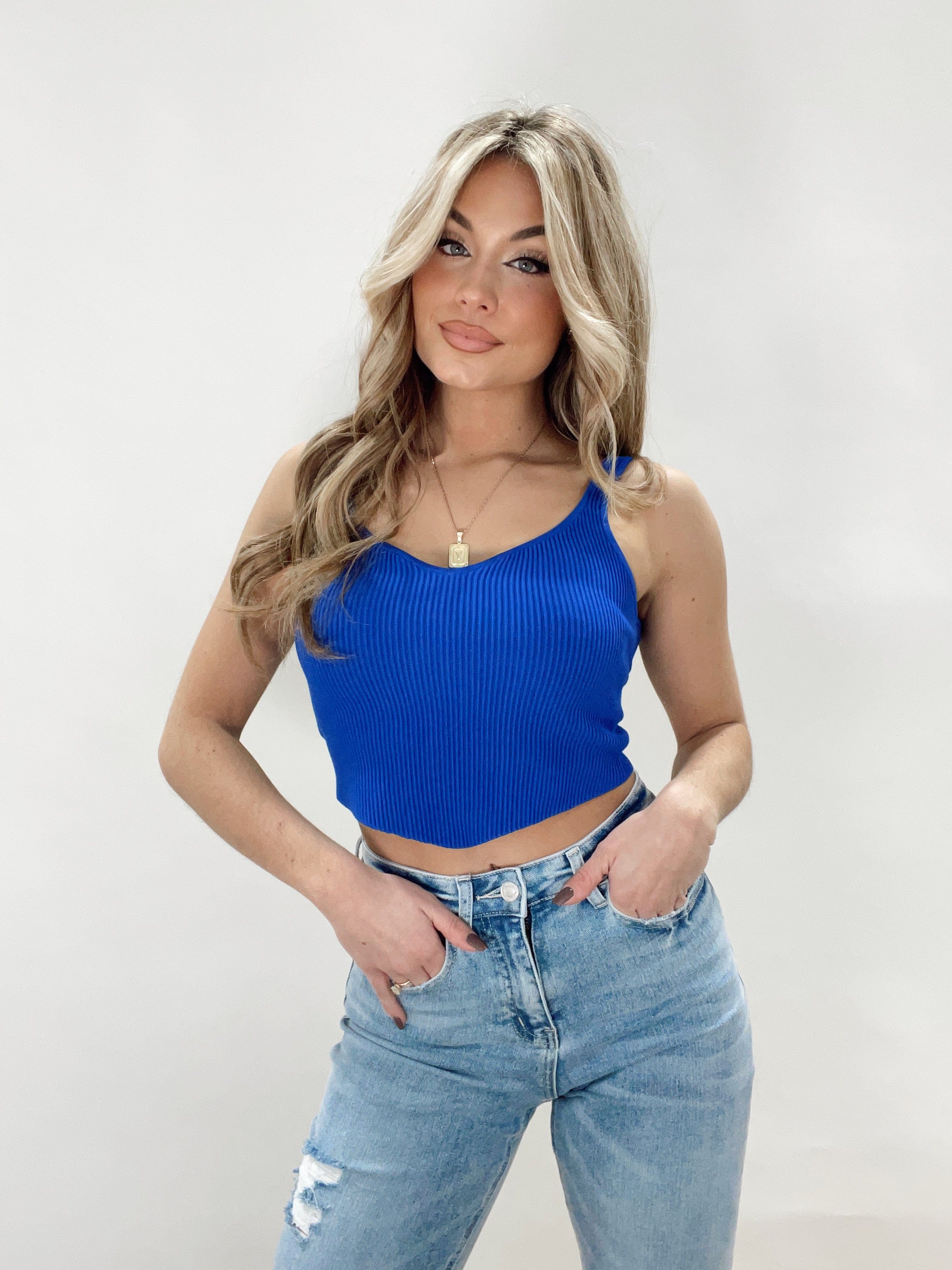 Experience the ultimate in spring-ready style with the Into The Blue Tank! Crafted from a luxurious royal blue ribbed knit material, this tank features a daring v-neckline, delicate thin straps, a chic pointed hem, and a flattering cropped fit. This basic and versatile staple piece is sure to elevate any outfit and make you feel confident and stylish. Be ready to turn heads and make a statement with this must-have tank.