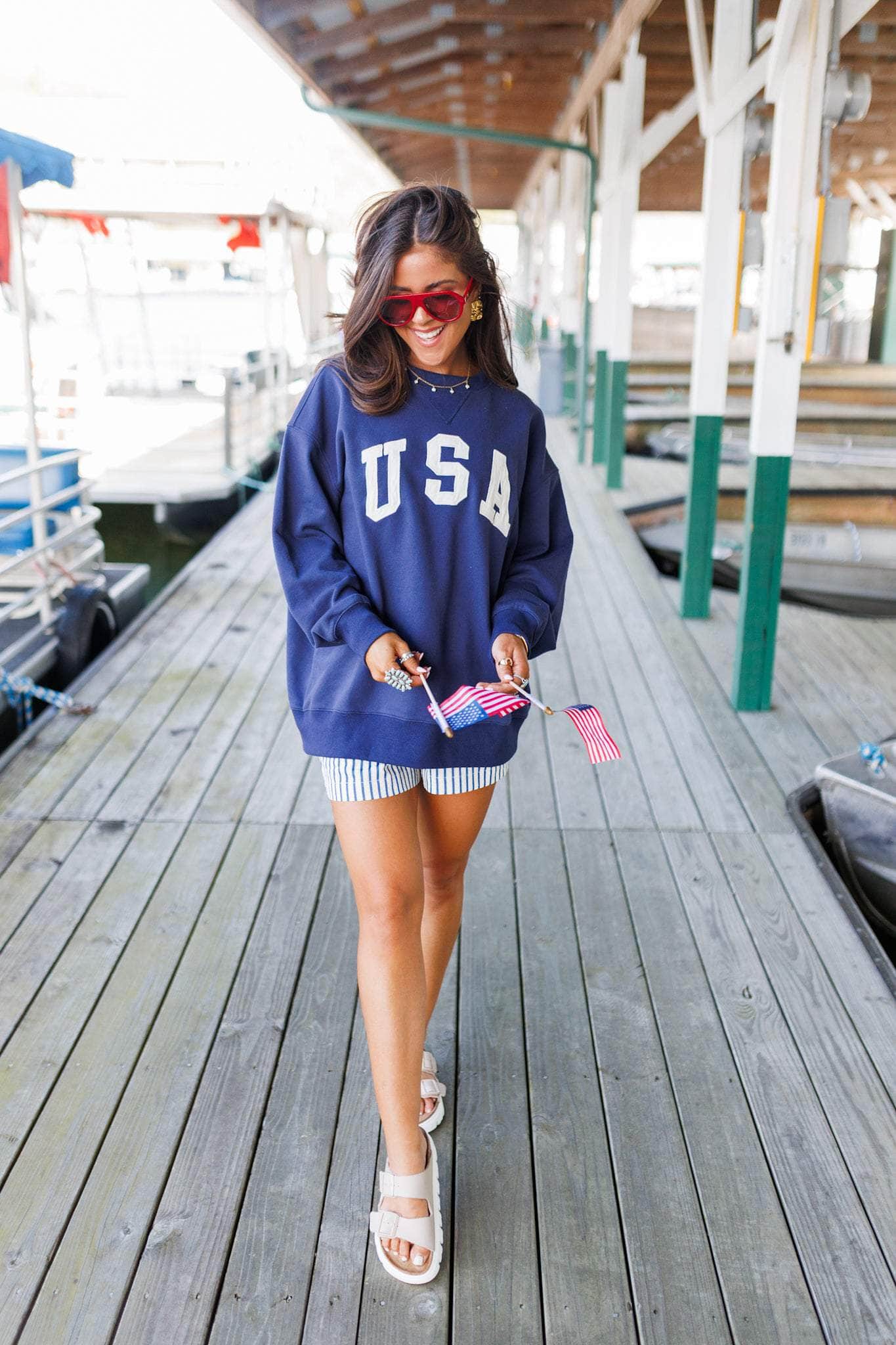 Expertly crafted from 100% cotton, this oversized pullover boasts bold USA graphics. Perfect for chilly summer nights, its long sleeves and crew neck provide both style and warmth. Stay stylish and comfortable in this must-have pullover.