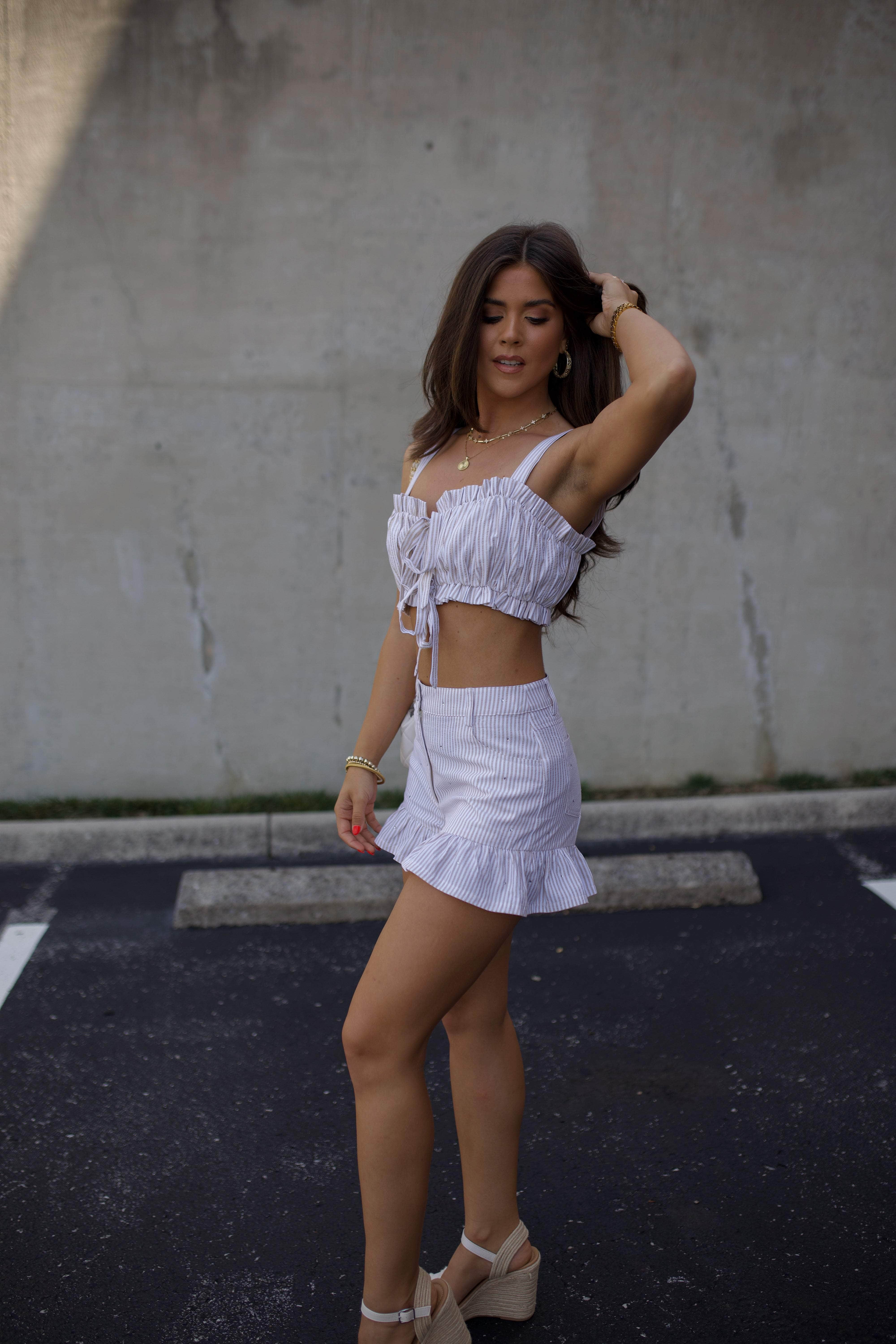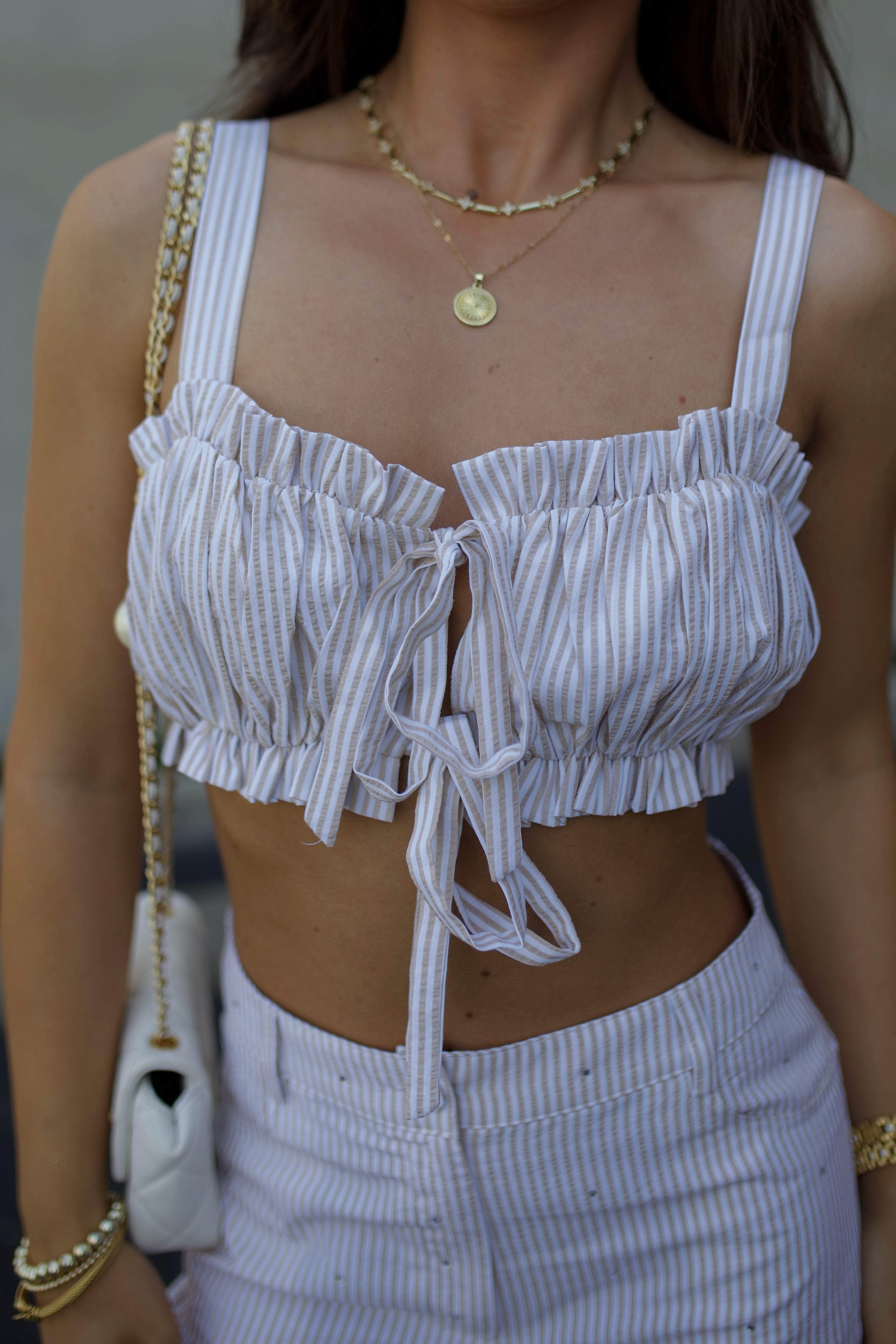 This top features a delicate ruffled hem and two adjustable front tie closures for a customizable fit. Sewn-in lining ensures comfort and coverage, while elastic bands at the top and bottom hems provide a gentle, slightly stretchy feel for easy wear.
