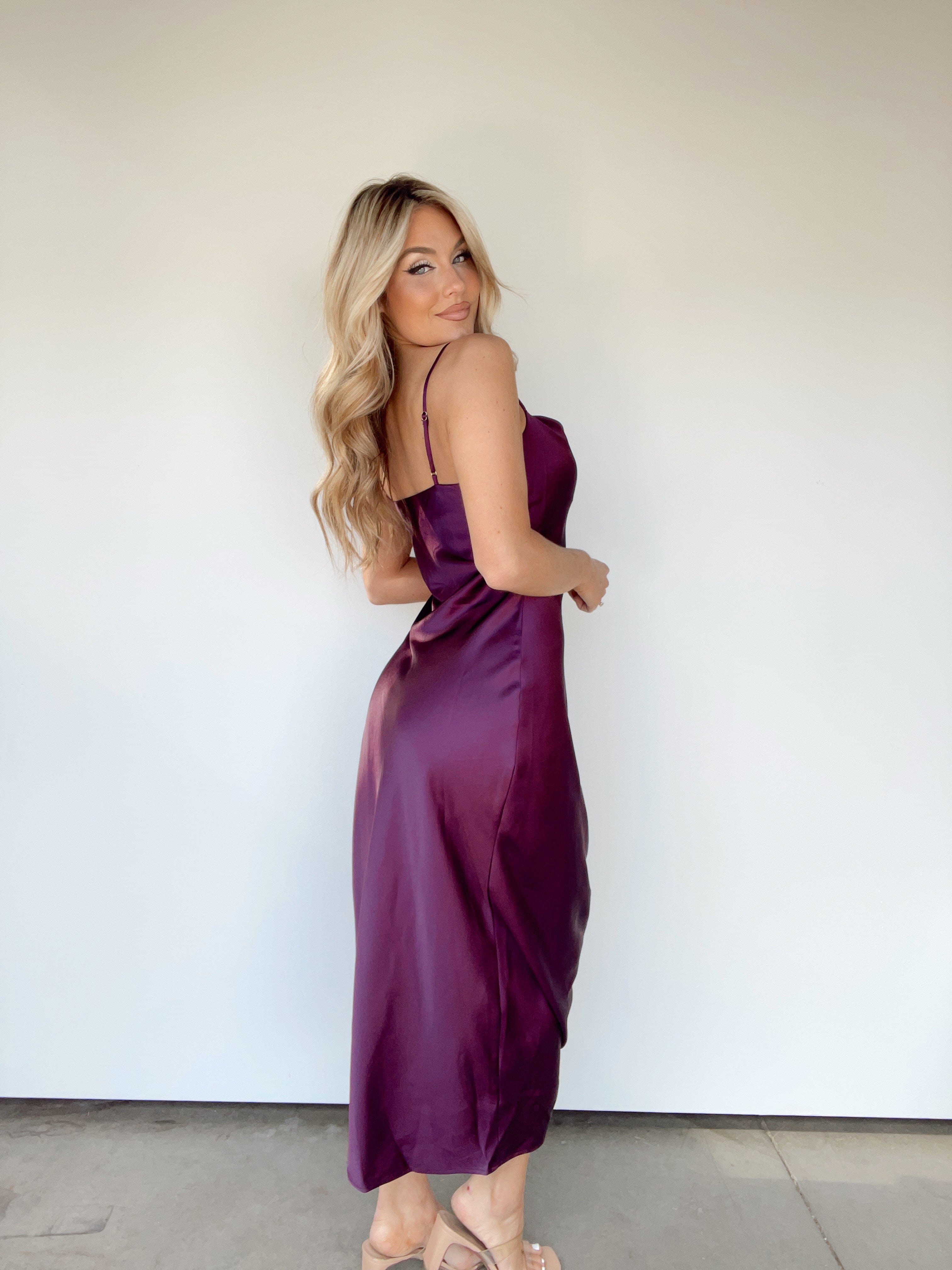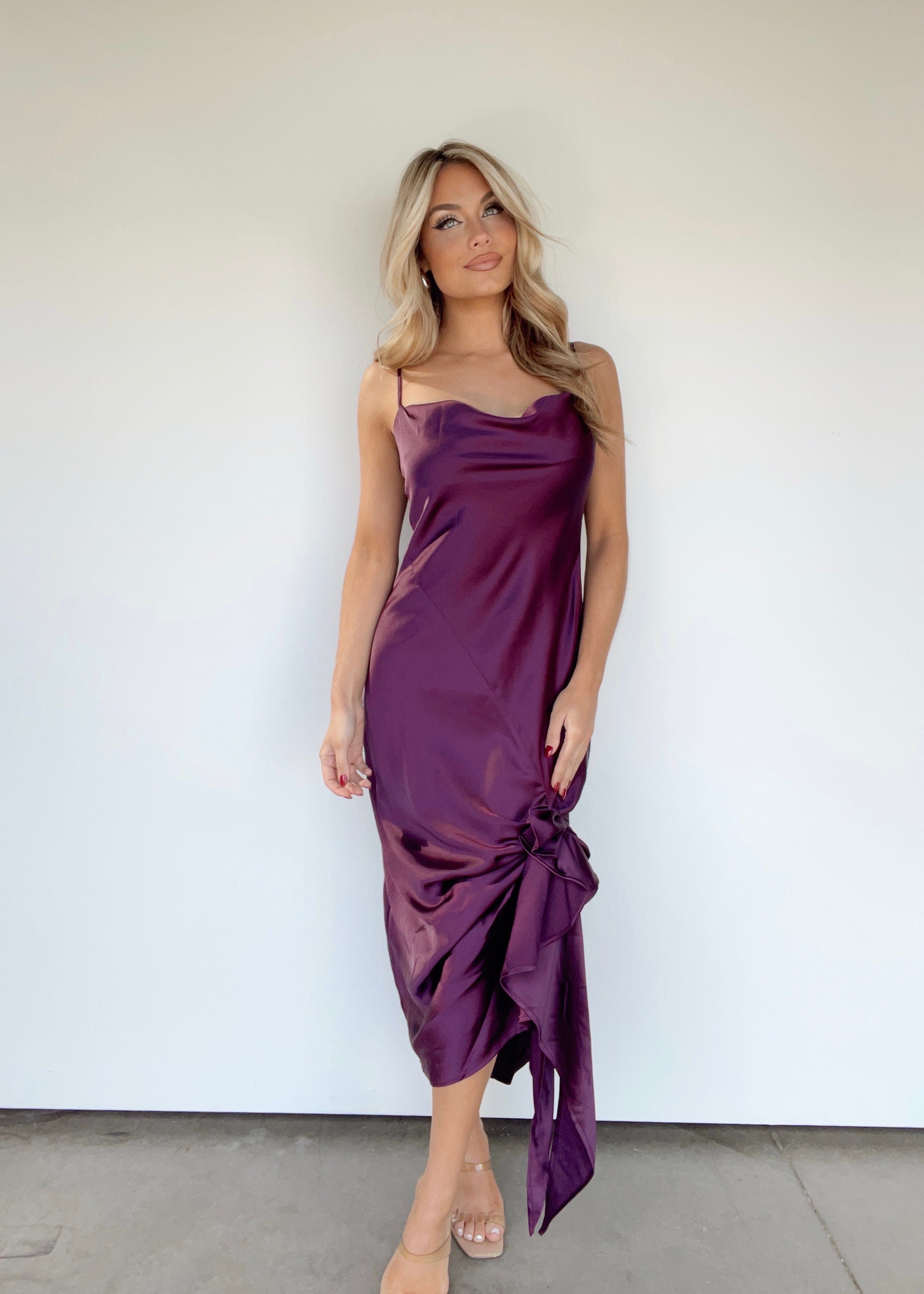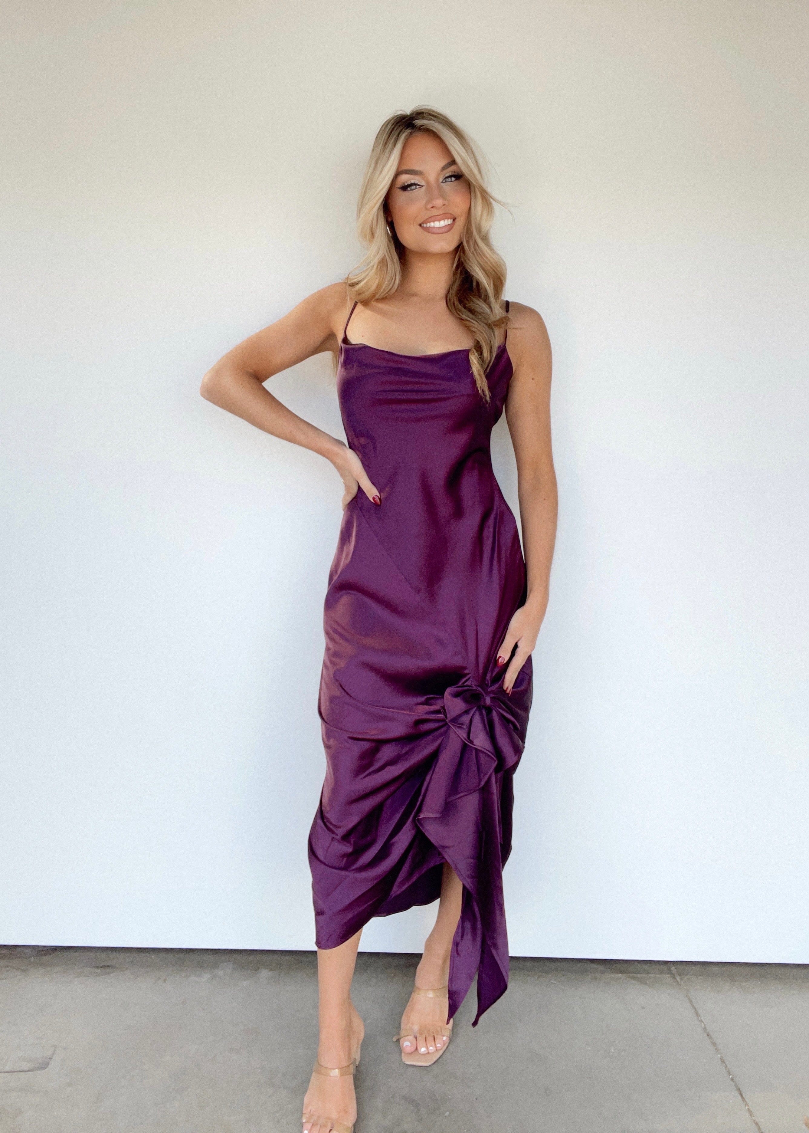 This elegant, elevated Celebrate The Night Dress features a cowl neck, thin adjustable straps, and a bow tie detail. Crafted from luxe satin with a midi fit, this dress is designed to make a statement with its eye catching pop of color. Perfect for formal events, dinner or drinks, or even as a wedding guest, this dress offers a classic sophistication that is both timeless and trendy.