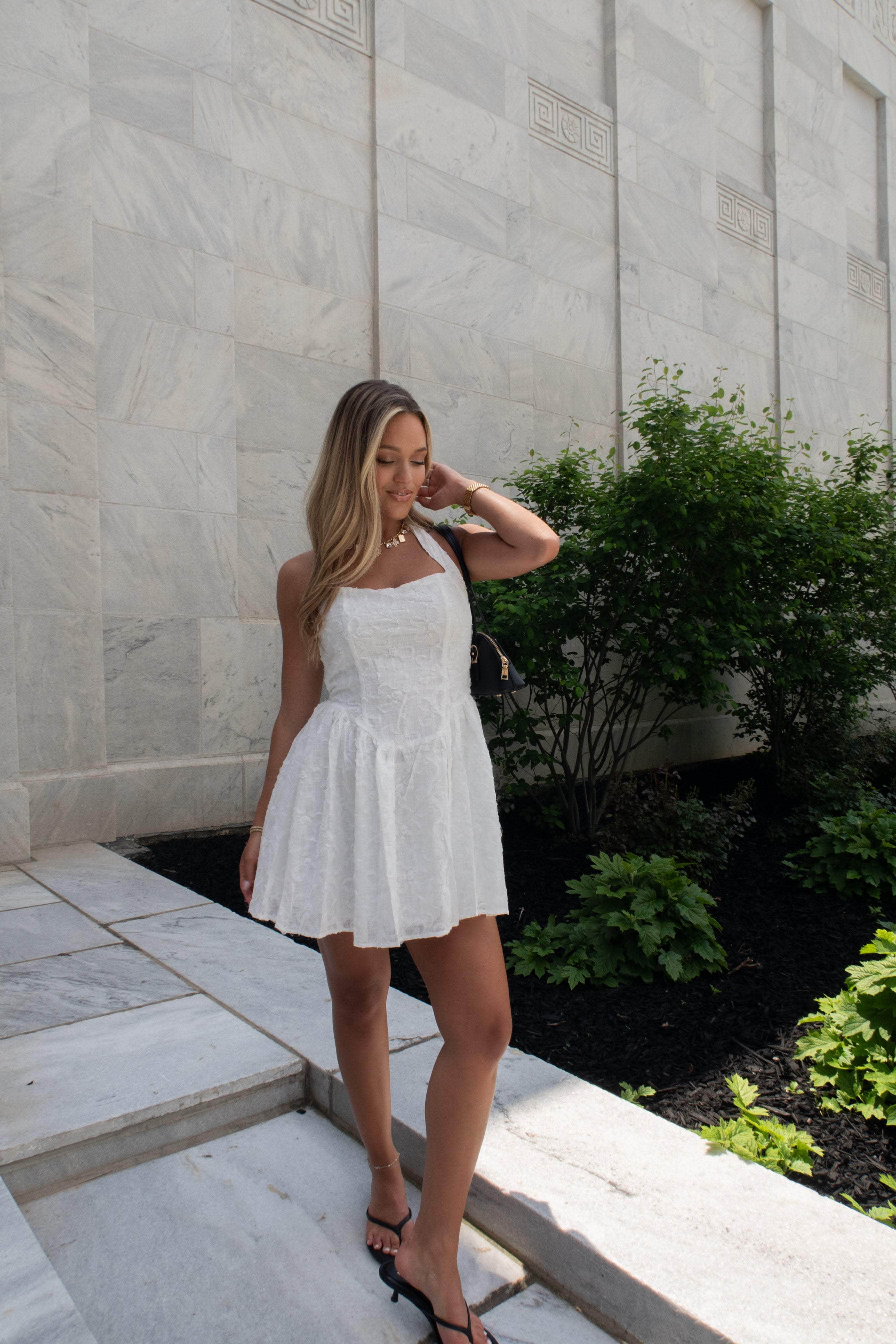 Timeless and refined, the Forever RSVP Dress is designed to make an impression. This white dress features a textured floral design and a subtle basque waist for a flattering, feminine silhouette. The adjustable halter neckline offers a customizable fit, while a silicone strip along the back hem helps keep the dress comfortably in place. Finished with a back zipper and hook-and-eye closure, and fully lined for a smooth, confident feel—perfect for bridal events, celebrations, or special occasions.