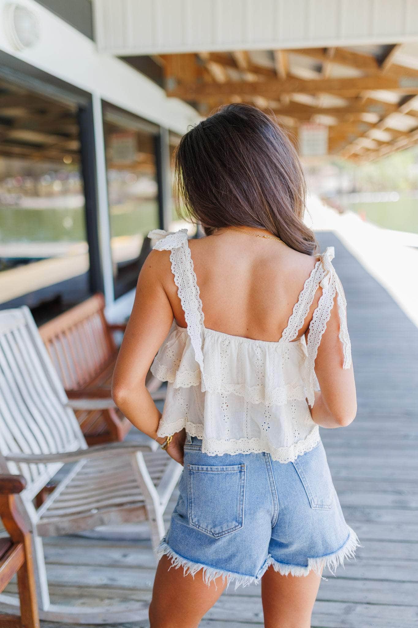The Cottage Kiss Eyelet Top features delicate lining at the bust and a tiered ruffle detail for a flattering fit. With tie shoulder straps and a lightweight 100% cotton fabric, it's a perfect blend of comfort and style. The eyelet design and lacey trim add a touch of romance to this charming top.