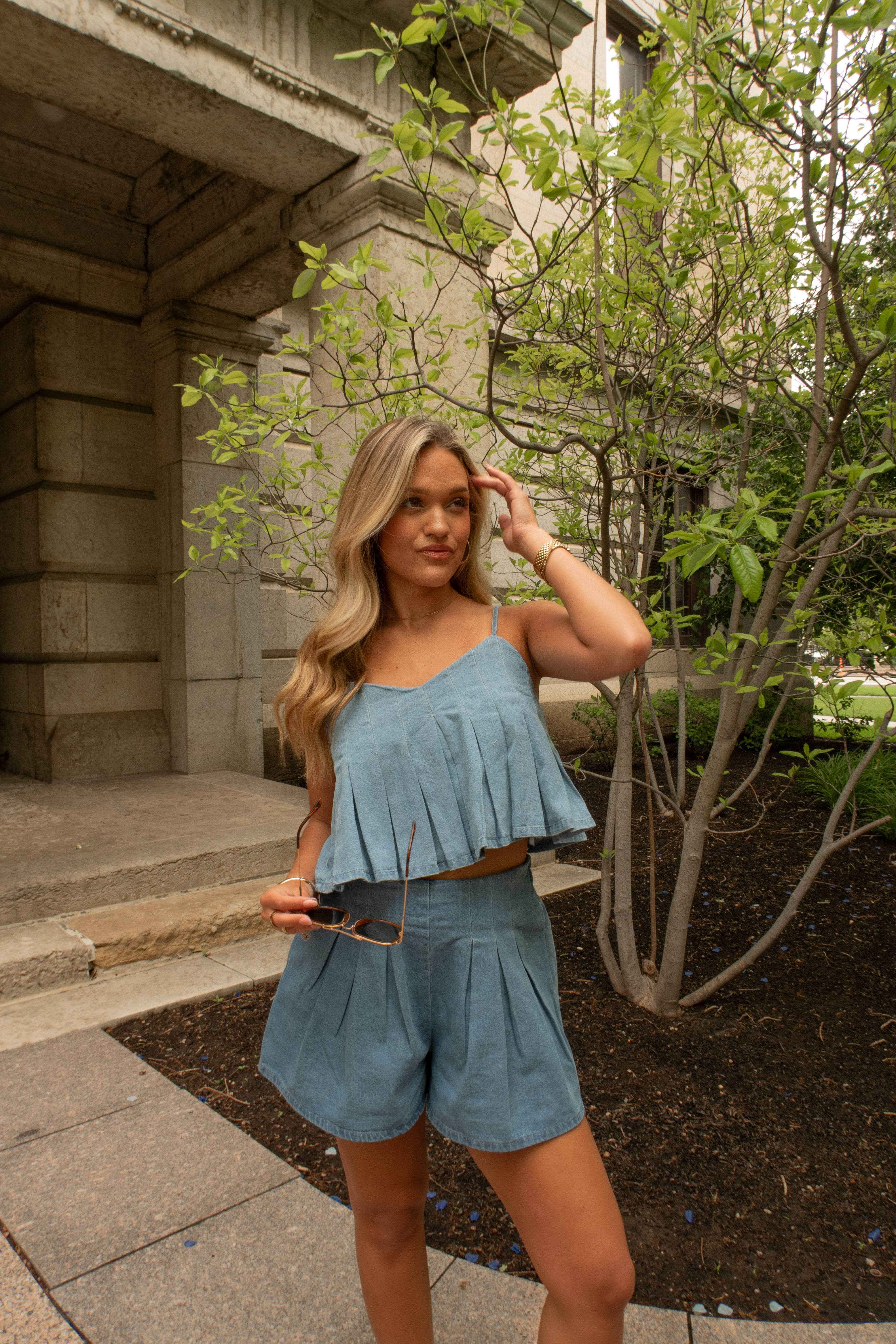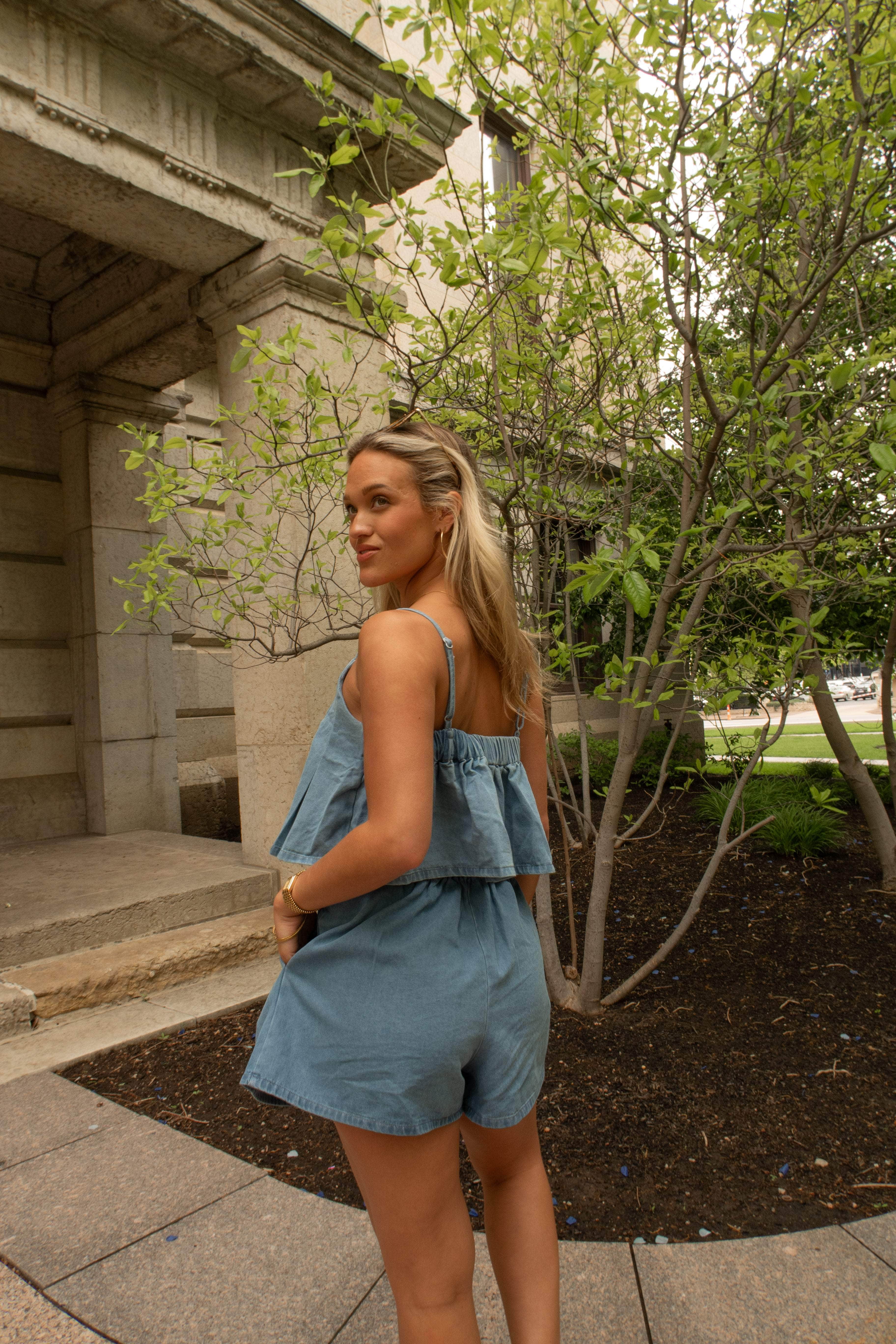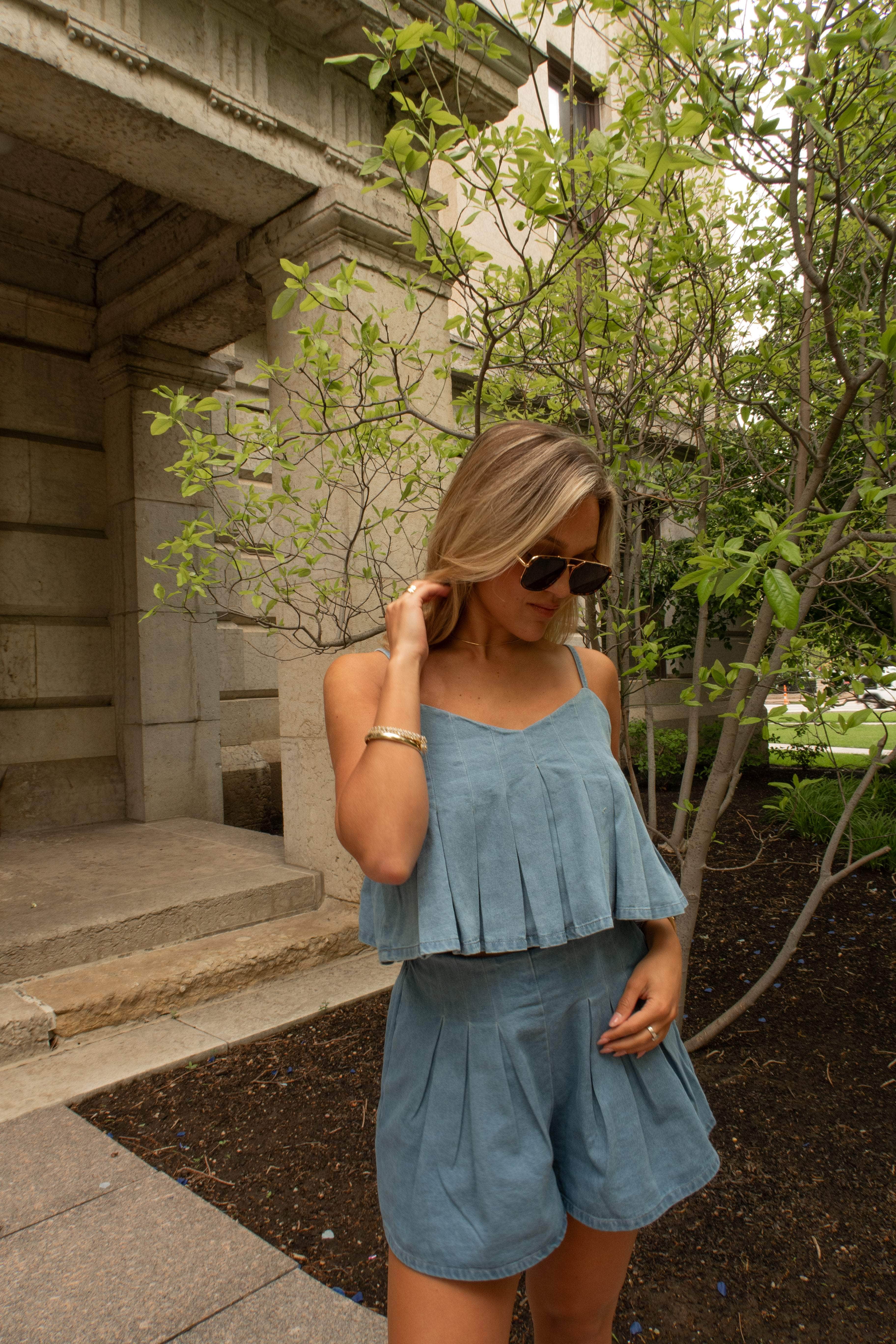 The Field Notes Top is a cropped, pleated flared top that combines style and comfort. Made from a durable denim cotton blend, it features adjustable spaghetti straps and an elastic band in the back for a secure, customizable fit. Pair it with the matching skort for a chic, coordinated look perfect for warm-weather days.
