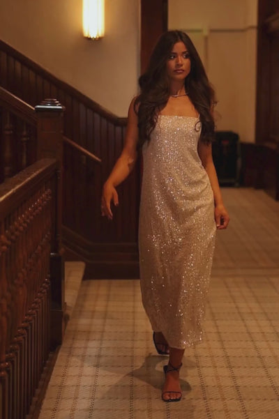 Be the center of attention with our Glamorous Countdown Dress. Featuring a side zipper closure and stretchy elastic straps, this maxi dress is both comfortable and stylish. The eye-catching sequin design adds a touch of glamour to any special occasion. Look and feel fabulous in this must-have dress.