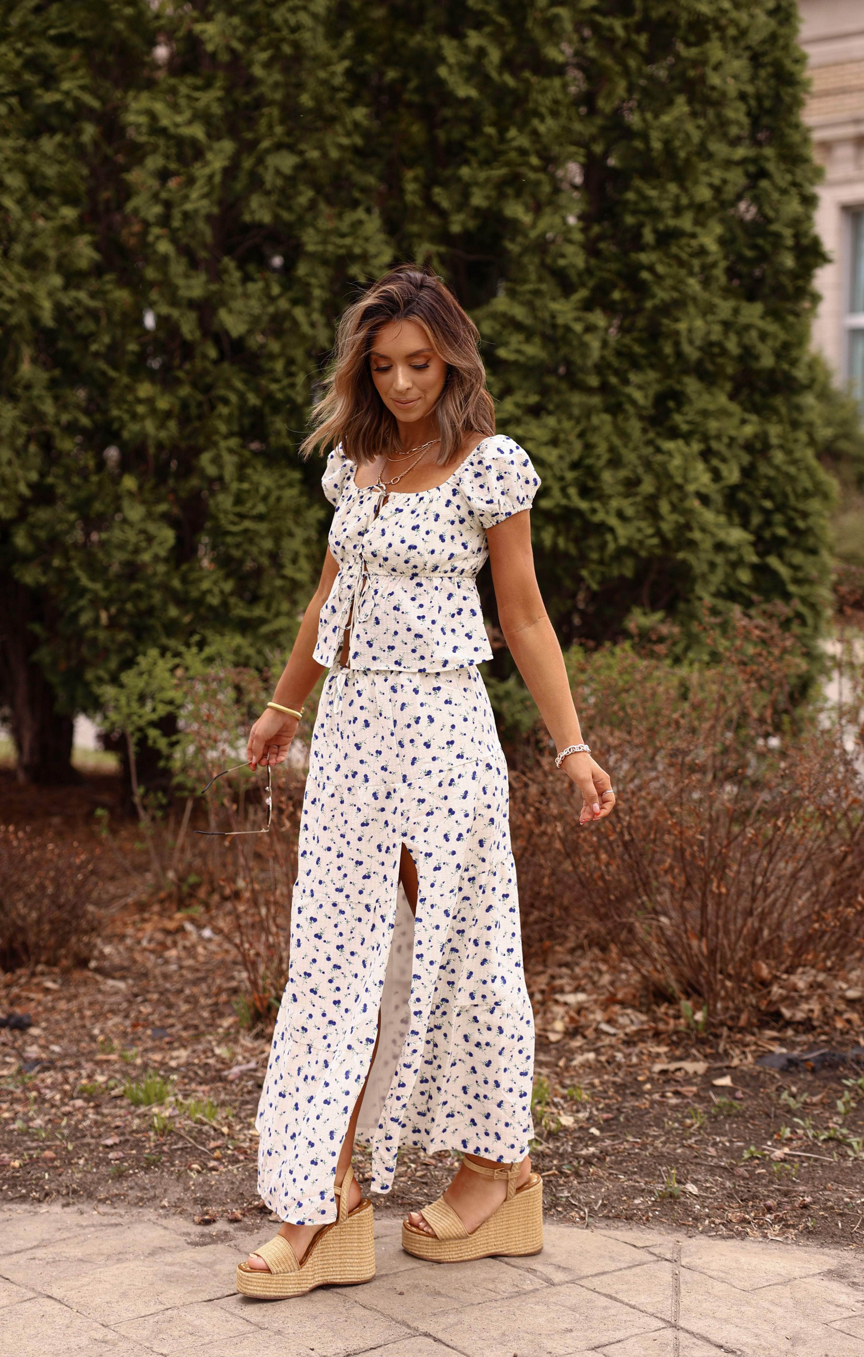Add a touch of elegance to your wardrobe with our In The Garden Skirt. The high waisted, tiered design and delicate floral pattern exude sweetness and grace. Featuring a side slit detail, adjustable drawstring waistband, and flowy maxi fit, this skirt is perfect for spring and summer occasions like date nights and garden parties. With a textured and comfortable feel, this skirt adds an elevated and stylish touch to any outfit.
