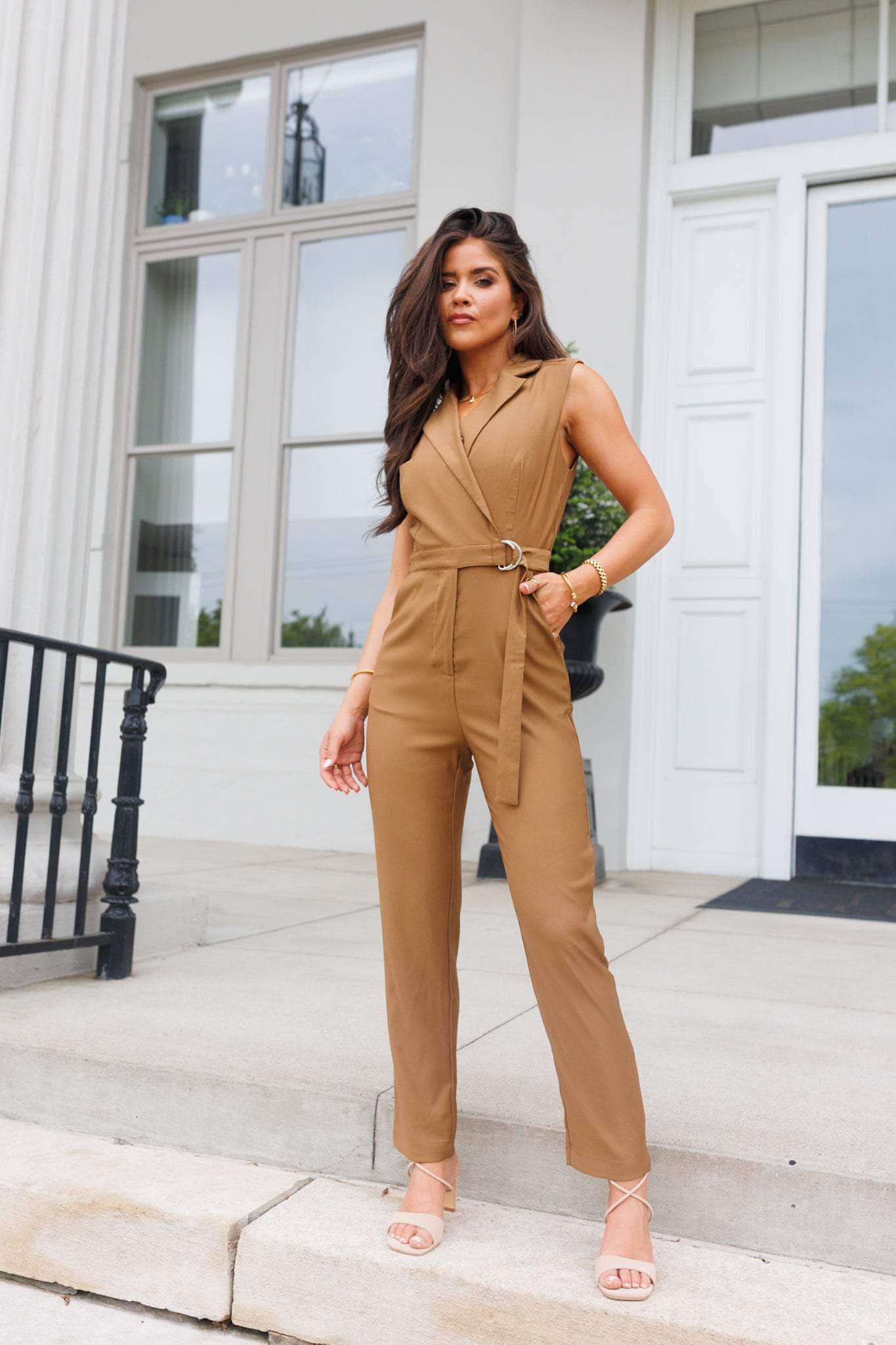 The Clocking Out Jumpsuit delivers sharp tailoring with a sleek, modern twist. Designed with a flattering V-neckline, buckle detail, and notched collar, this sleeveless silhouette is all about confident structure. The soft stretch fabric shapes to your frame with ease, while the belted waist and straight leg finish the look. Available in bold red or a rich neutral, it’s a standout piece made to move with you.