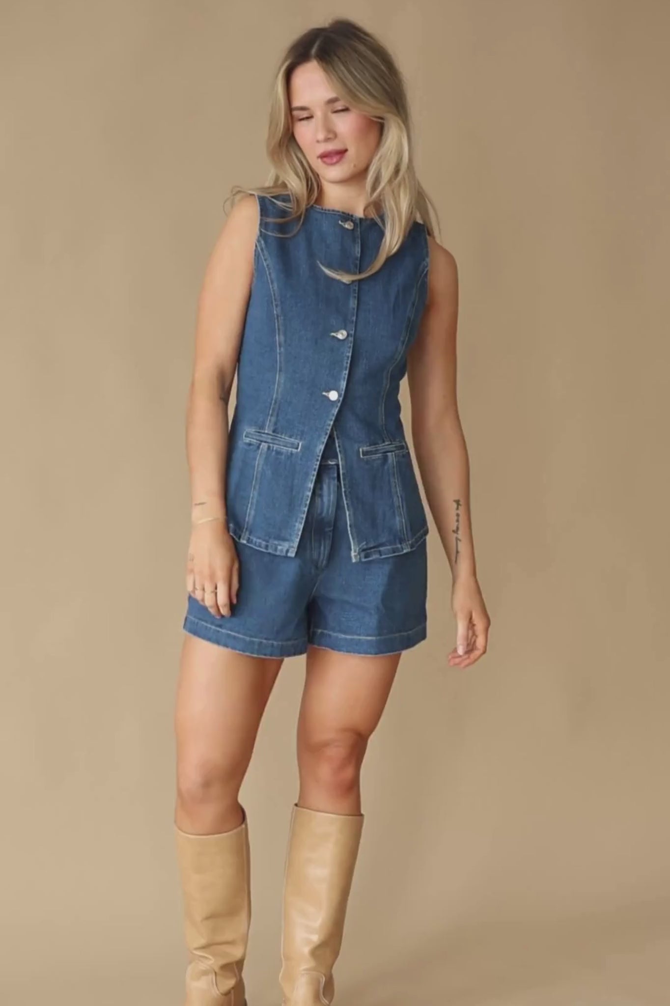 Expertly crafted, the Melrose button down denim vest offers a classic and polished look. Made from 100% cotton, this vest features a round neckline, quarter length back slit, and angled bottom hem for a flattering fit. Faux pockets add a touch of sophistication.