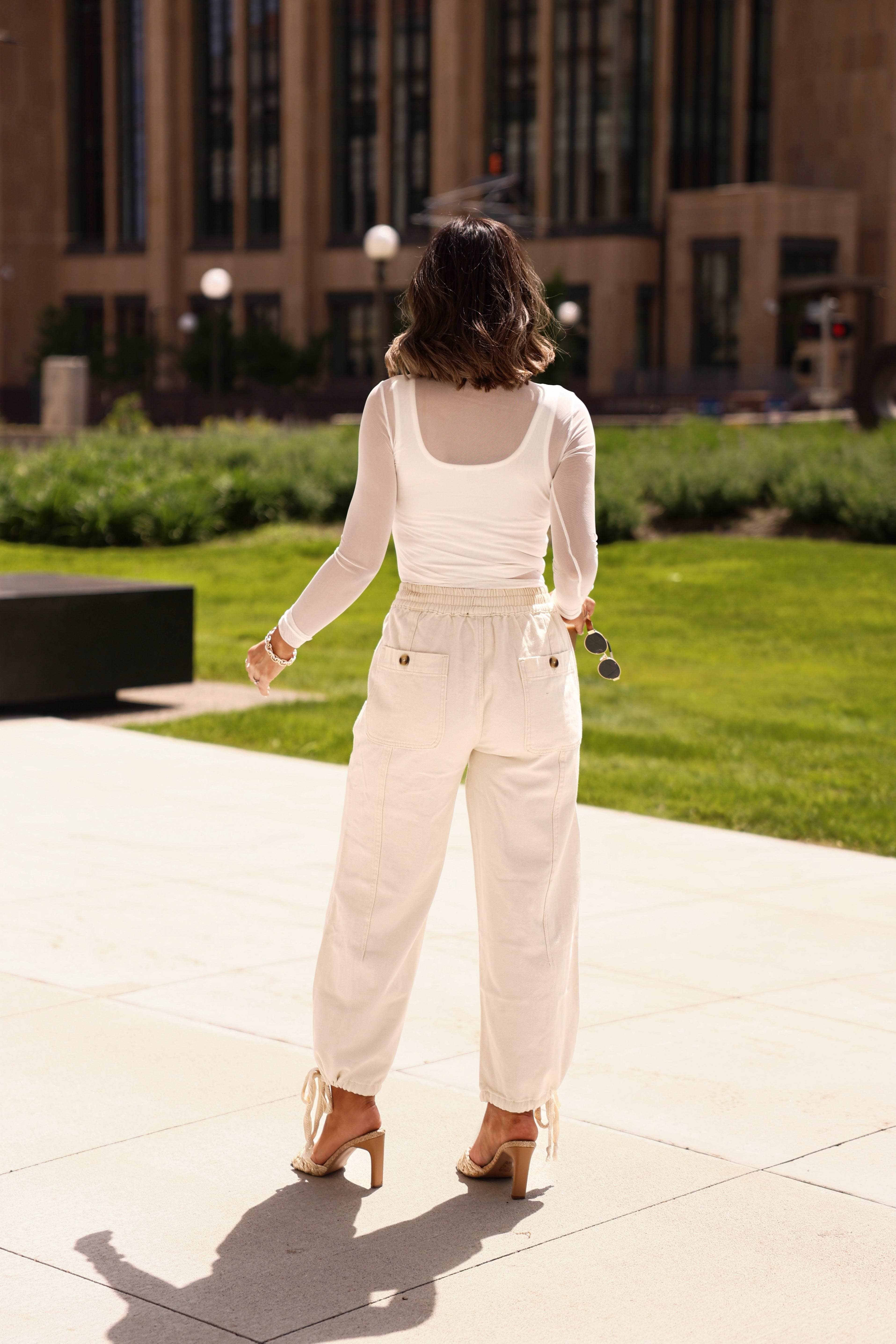 Versatile Neutral Ground Cargo Pants feature an elastic waistband with adjustable front tie for perfect fit. Practical design includes double deep front pockets and secure button-closure thigh pocket. Made from 100% breathable cotton with clever adjustable hem ties to customize your look—from relaxed to tapered. The ultimate blend of comfort and utility for your everyday adventures!