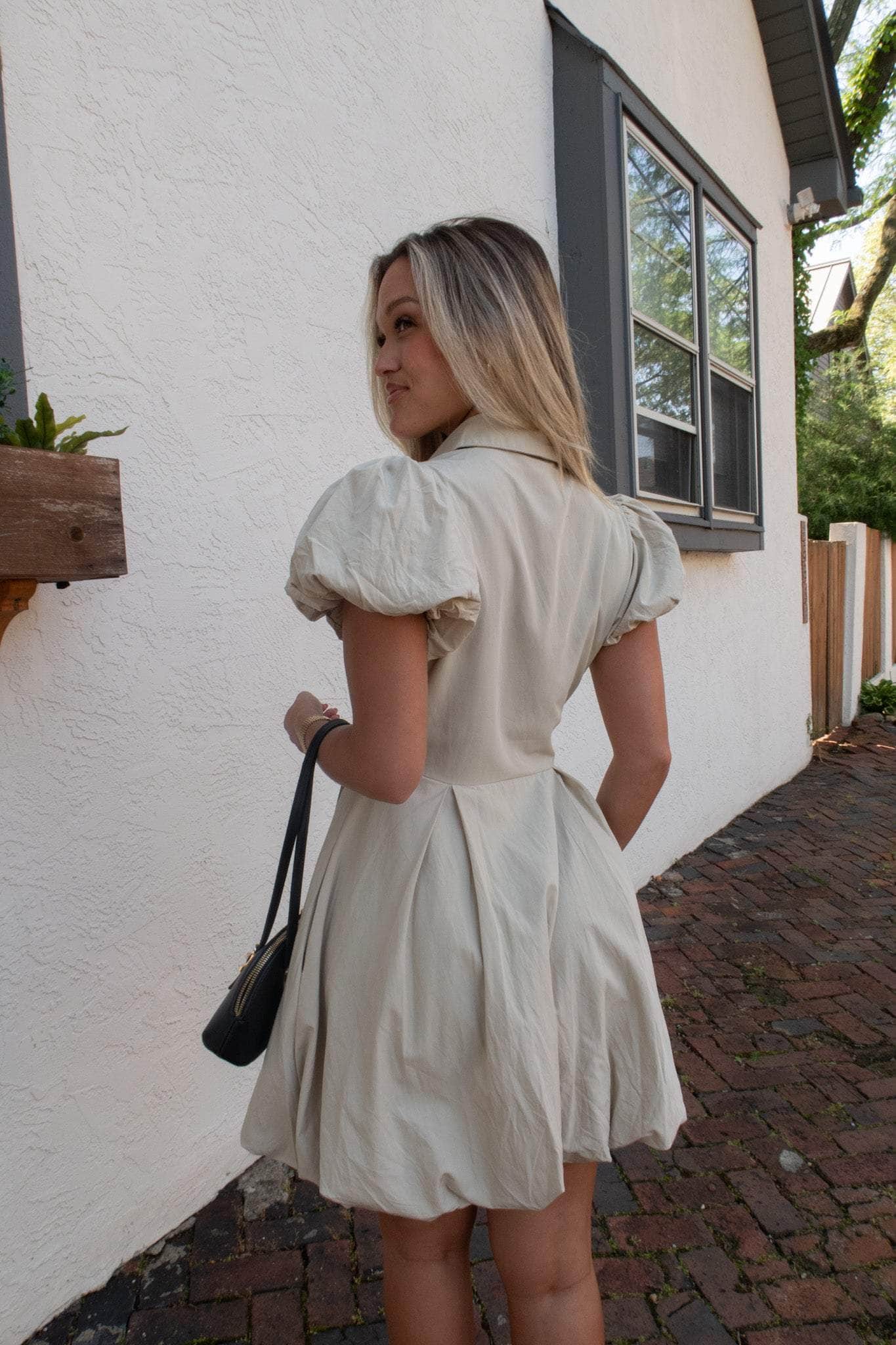 Soft cotton blend button-up dress with a collared neckline, puff sleeves, and a puff hemline. Designed with an A-line silhouette and side pockets for added convenience. An easy go-to for everyday or casual outings.