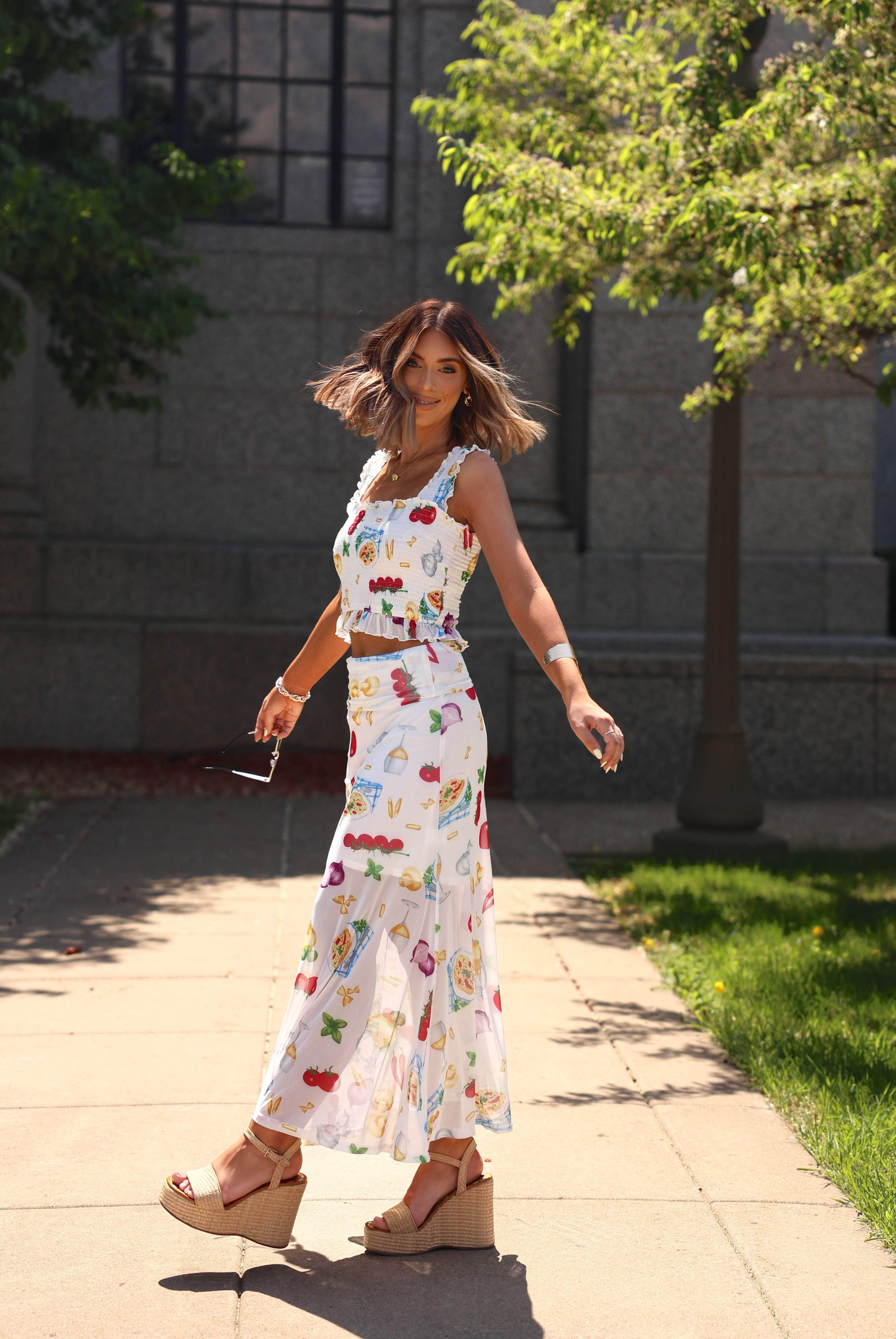 Sweet and fun, this top is a charming standout. Featuring an all-over playful Italian food print, it’s made from soft smocked fabric with elastic ribbing for a stretchy, comfortable fit. The square neckline is framed by delicate ruffles at the shoulders and neckline, while a sheer ruffle hem adds a light, romantic touch. Pair it with the matching mesh maxi skirt for a fun, coordinated look that's perfect for sunny days or vacation strolls.