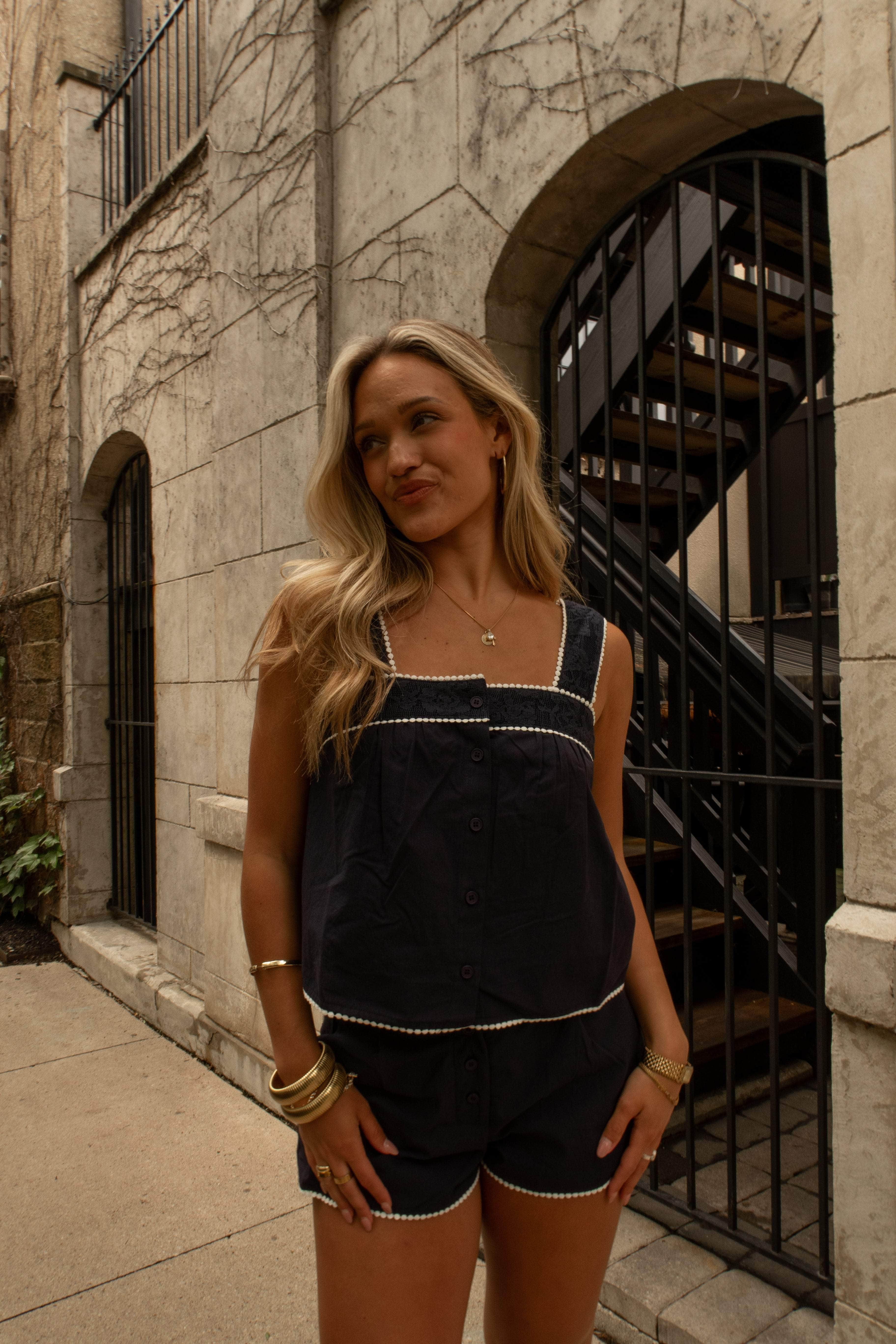 The Picket Fence Top is the perfect blend of playful and casual. Featuring a button closure down the front, this cropped, oversized top is adorned with lace detail on the straps and bust for a feminine touch. The white trim and pleated detailing add extra charm, while the lightweight cotton-blend fabric ensures comfort for warmer days. Pair it with the matching shorts for a coordinated, cute summer look.