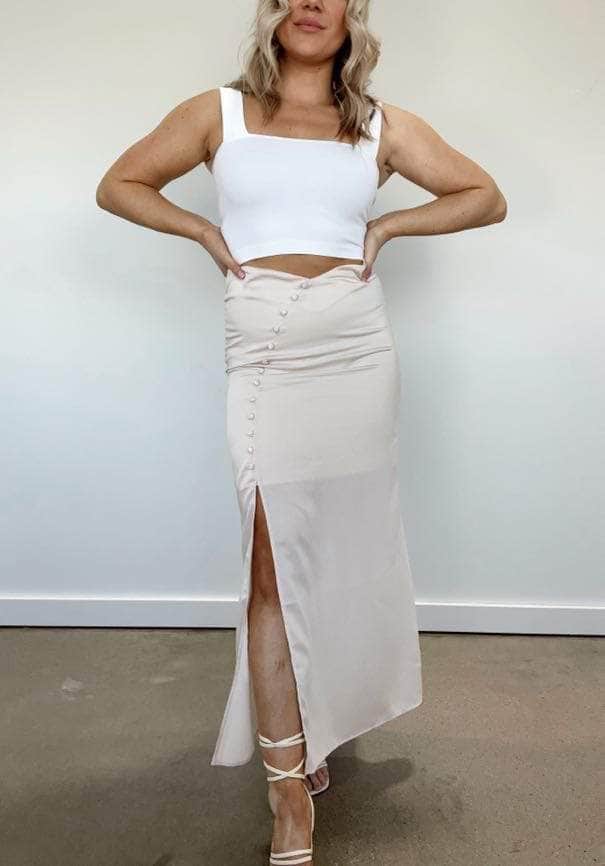 Embrace effortless elegance with the Romance Story Midi Skirt. Crafted from lightweight and airy satin, this sophisticated skirt features a maxi fit and subtle ruching for a touch of refinement. Button details, neutral color, fitted silhouette and a subtle side slit make it a versatile staple for any modern wardrobe. This skirt is perfect for romantic outings or elevated everyday looks.
