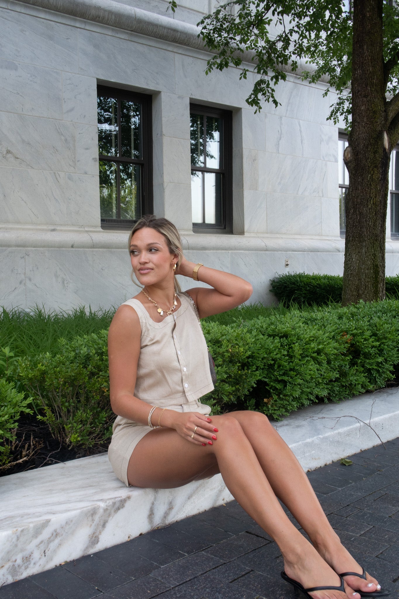 This top features front button closures and an open back design with an adjustable tie. A wide, rounded collar adds a soft structure, while black contrast stitching brings just the right amount of edge to this airy piece.