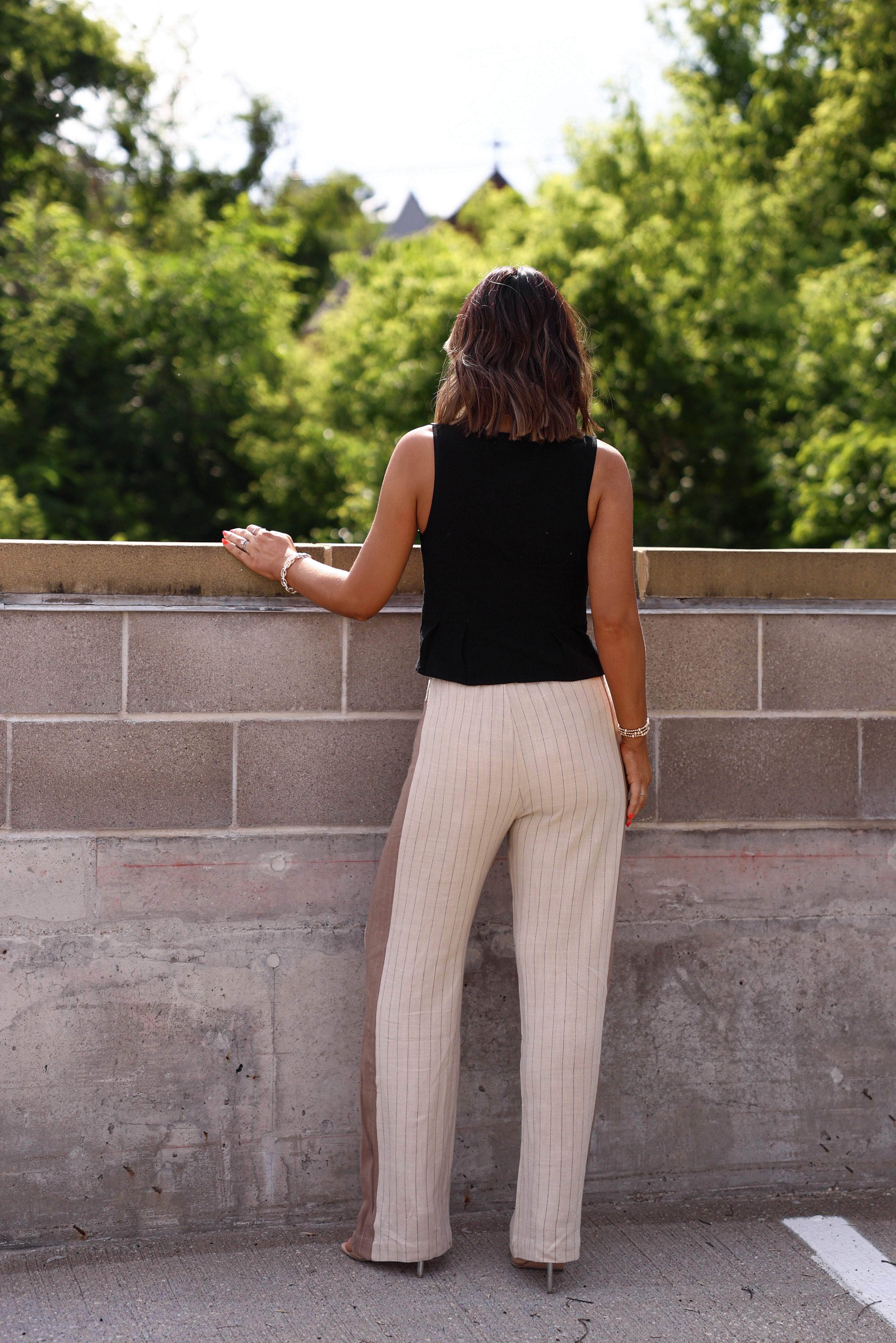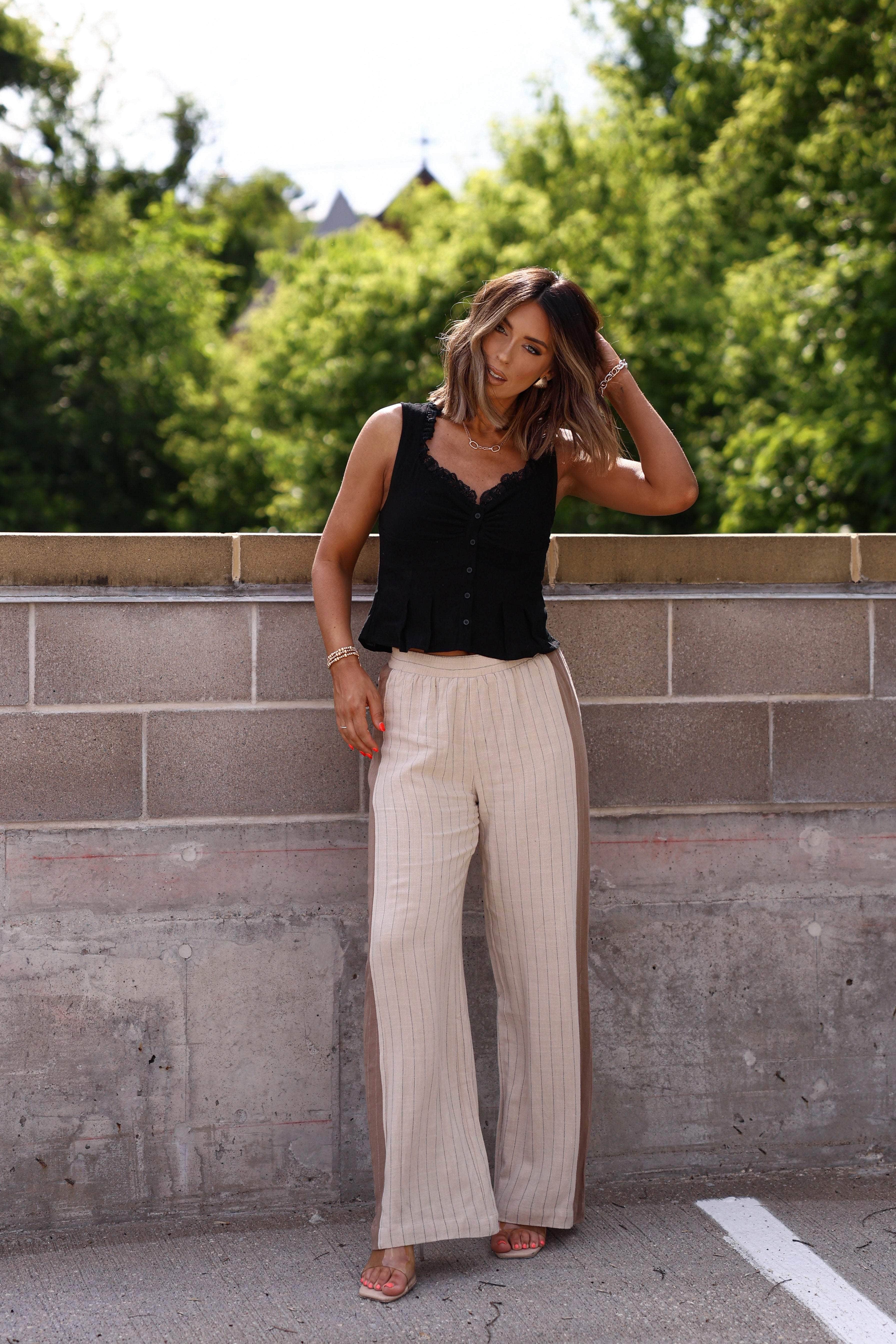 Made from a soft linen blend, these pants feature an elastic waistband for an easy, comfortable fit. Brown stripe contrast down the outer legs adds just the right amount of detail to keep things interesting.