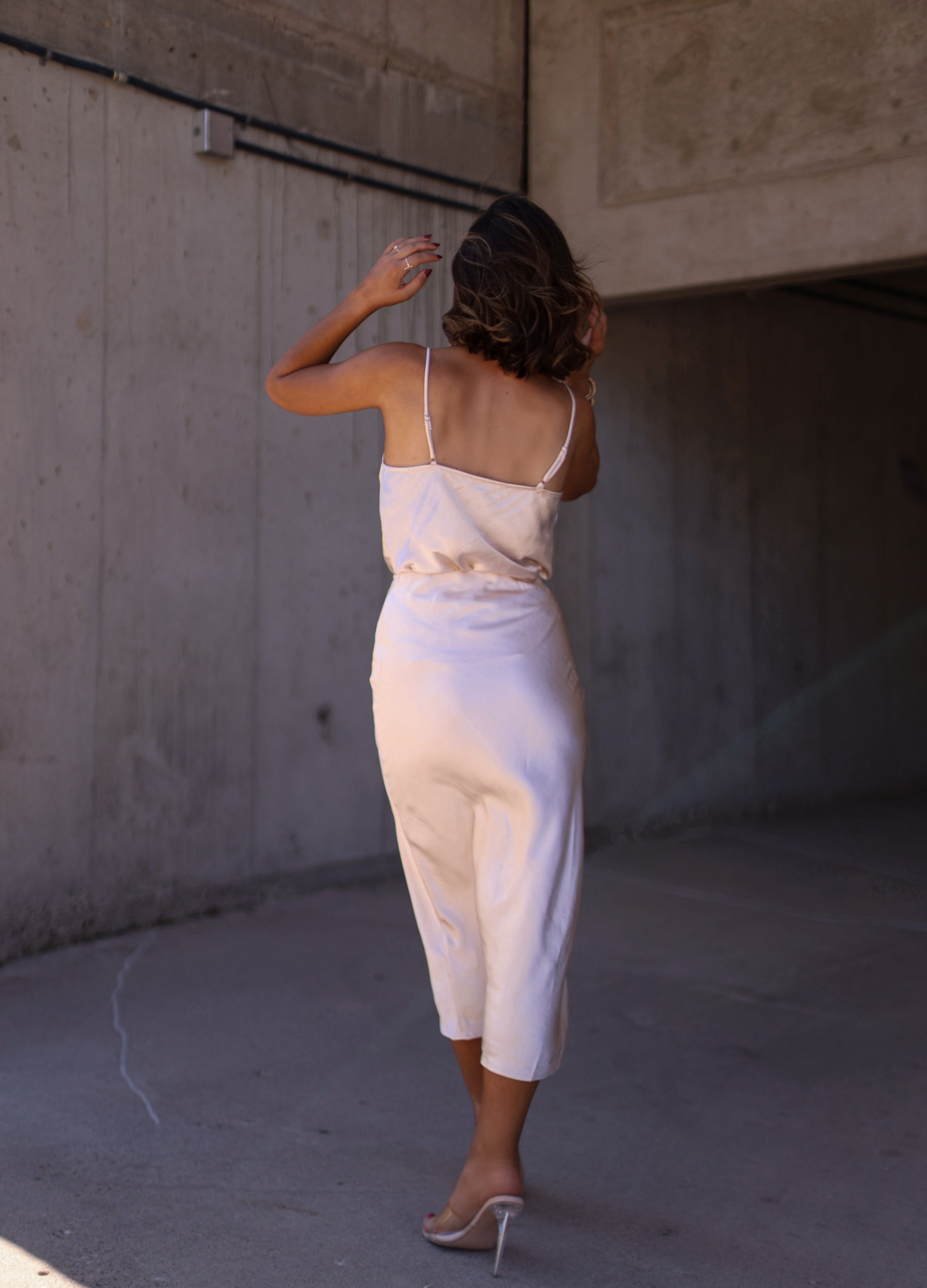 Add a touch of elegance to your wardrobe with our Sleek Satin Skirt. Designed in a midi length with a stretchy waistband, this skirt offers a sophisticated look perfect for any occasion. Elevate your style with this satin inspired skirt.