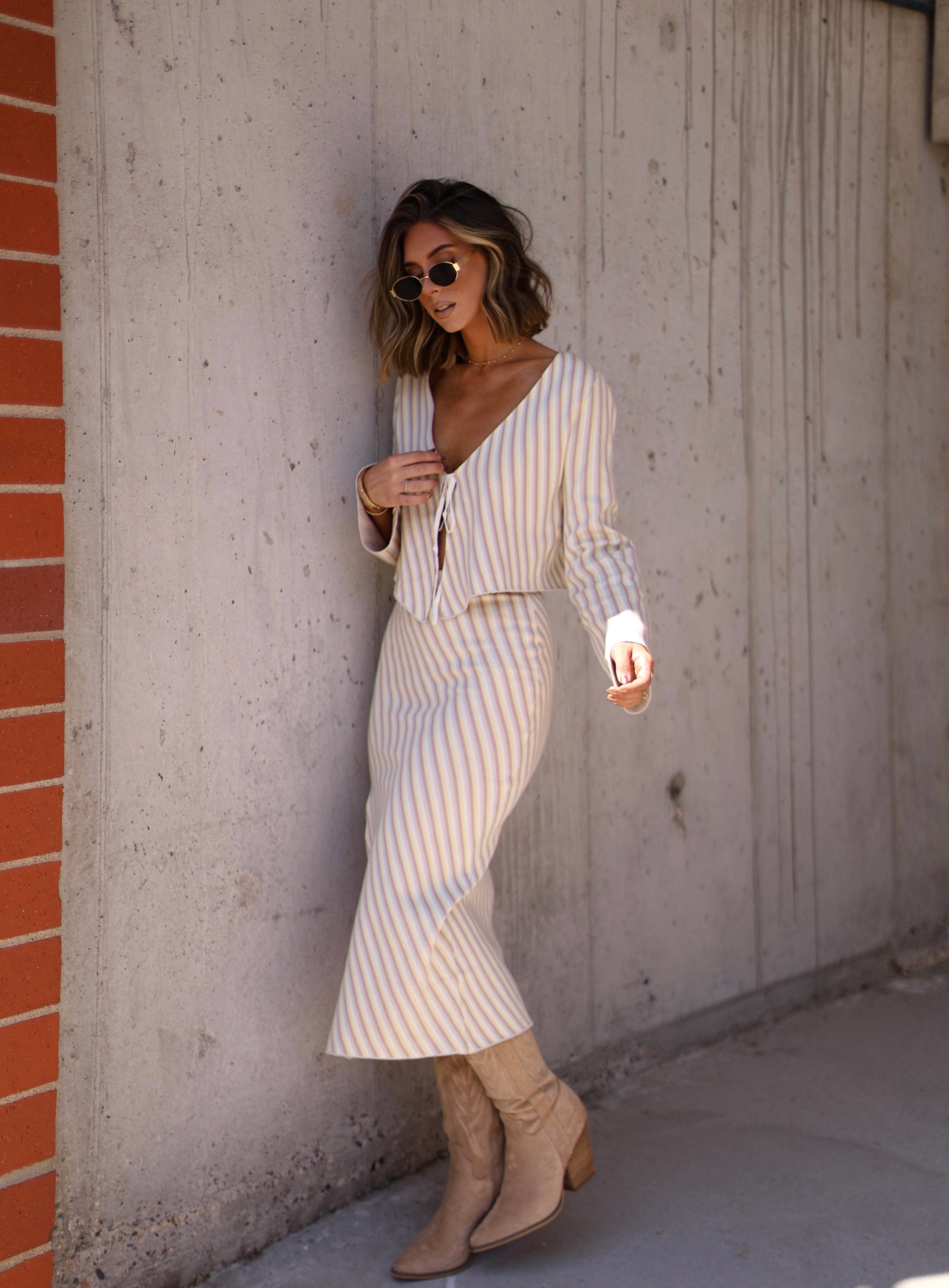 Elevate your style in our Sonoma Sunrise Skirt. This classy piece features an elastic waist for a comfortable fit, while the side slit adds a touch of sophistication. With a midi length and timeless striped design, this skirt is the perfect addition to your wardrobe.