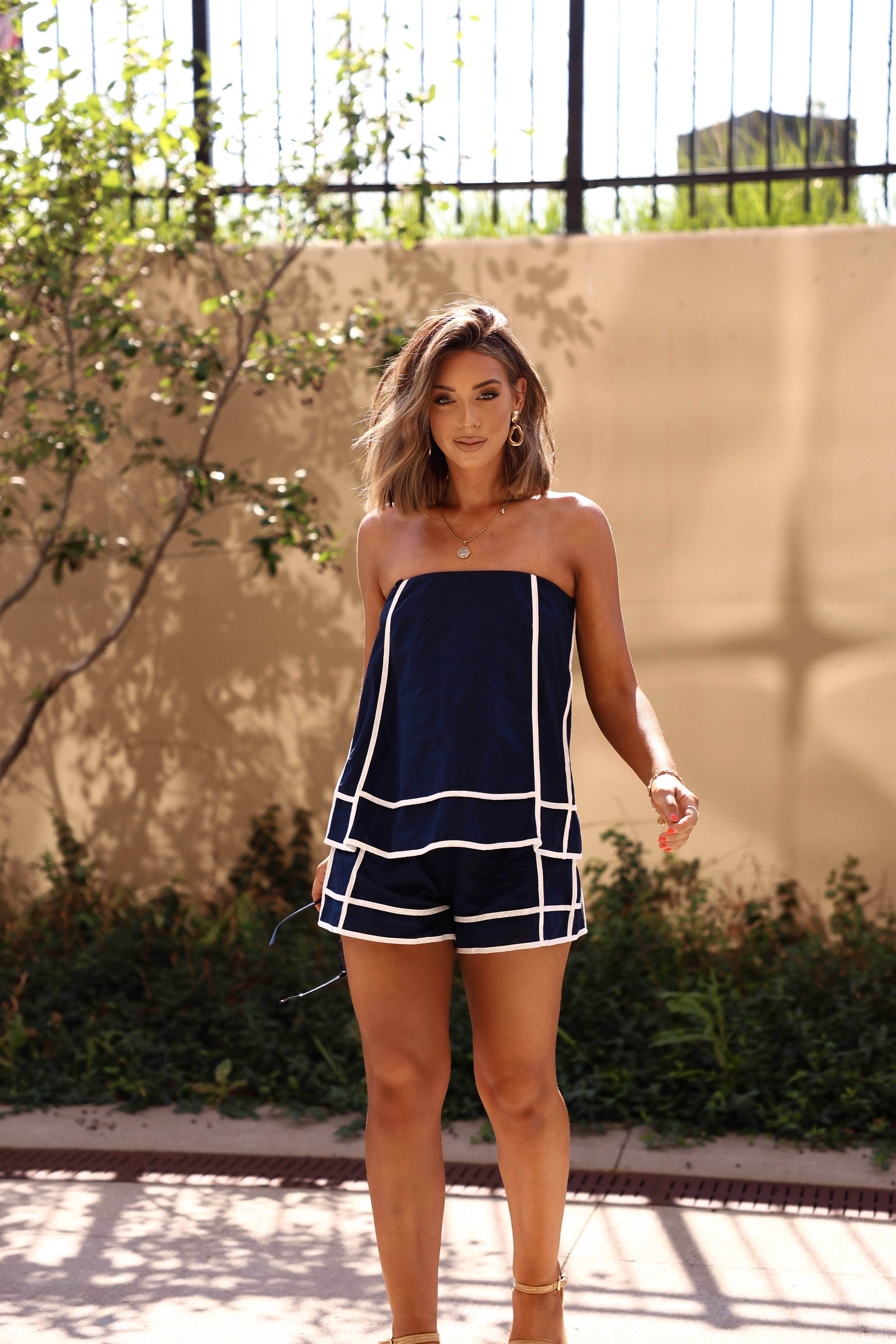 This romper is all about easy, breezy style! Featuring a soft, lightweight cotton blend overlay in navy with crisp white contrast lining details for a fresh, clean look. The stretchy bust comes with a silicone grip seam to keep everything comfortably in place. Perfect for sunny days when you want to look effortlessly put-together.