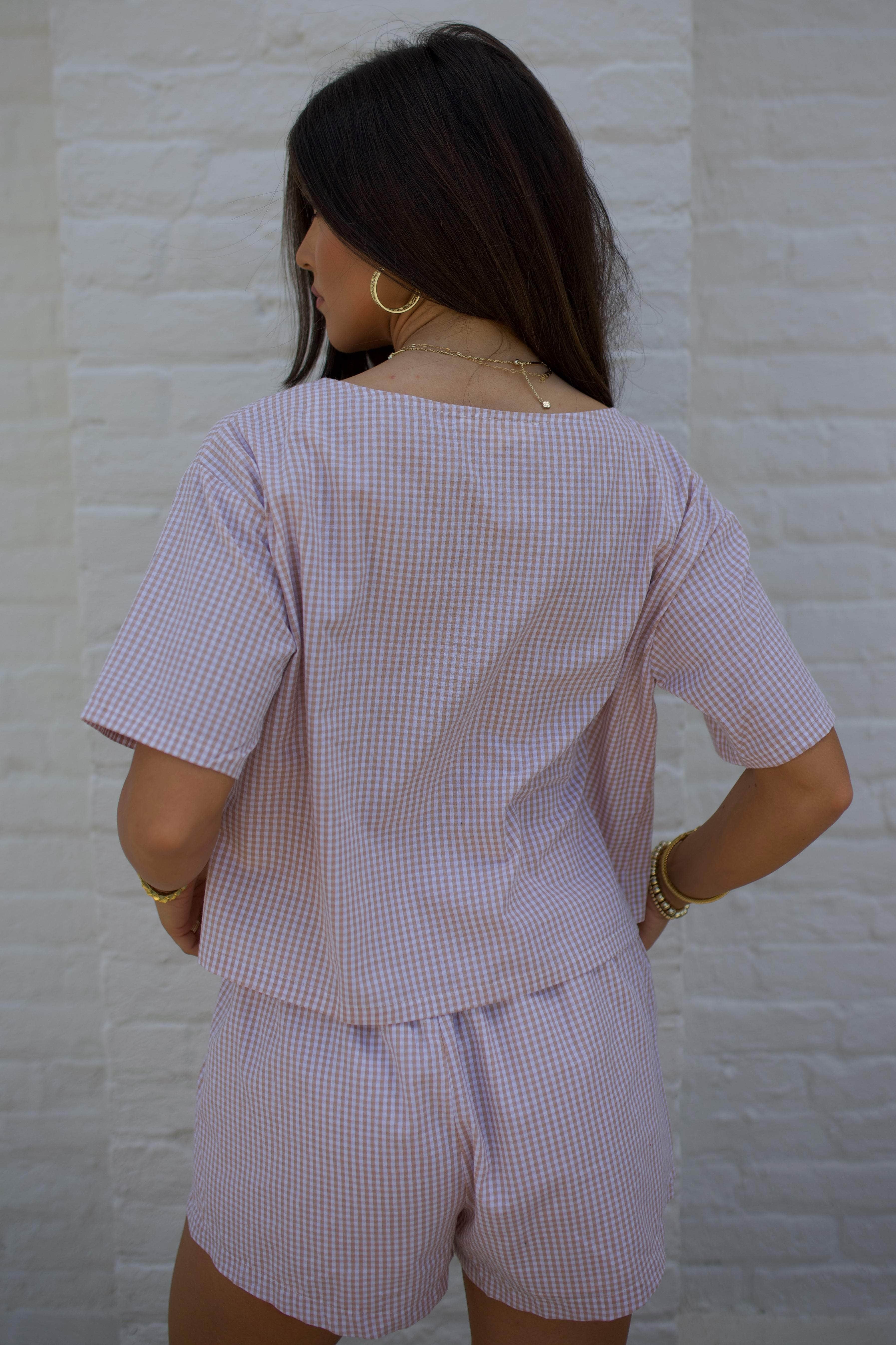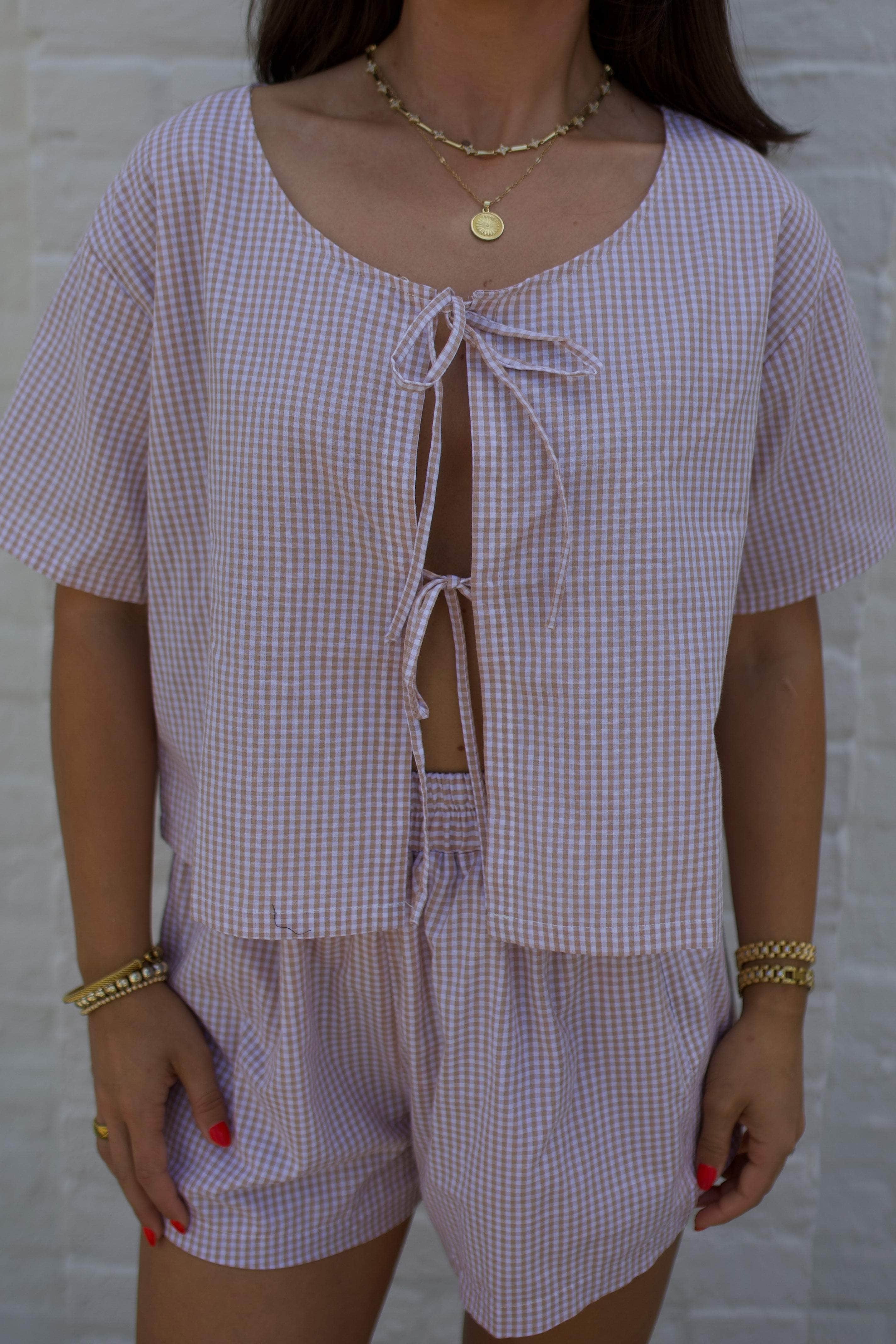 This short sleeve top features a gingham print with adjustable ties at the center for a customizable fit. Made from lightweight, 100% cotton fabric, it offers breathable comfort. Paired perfectly with matching shorts for an easy, coordinated look.