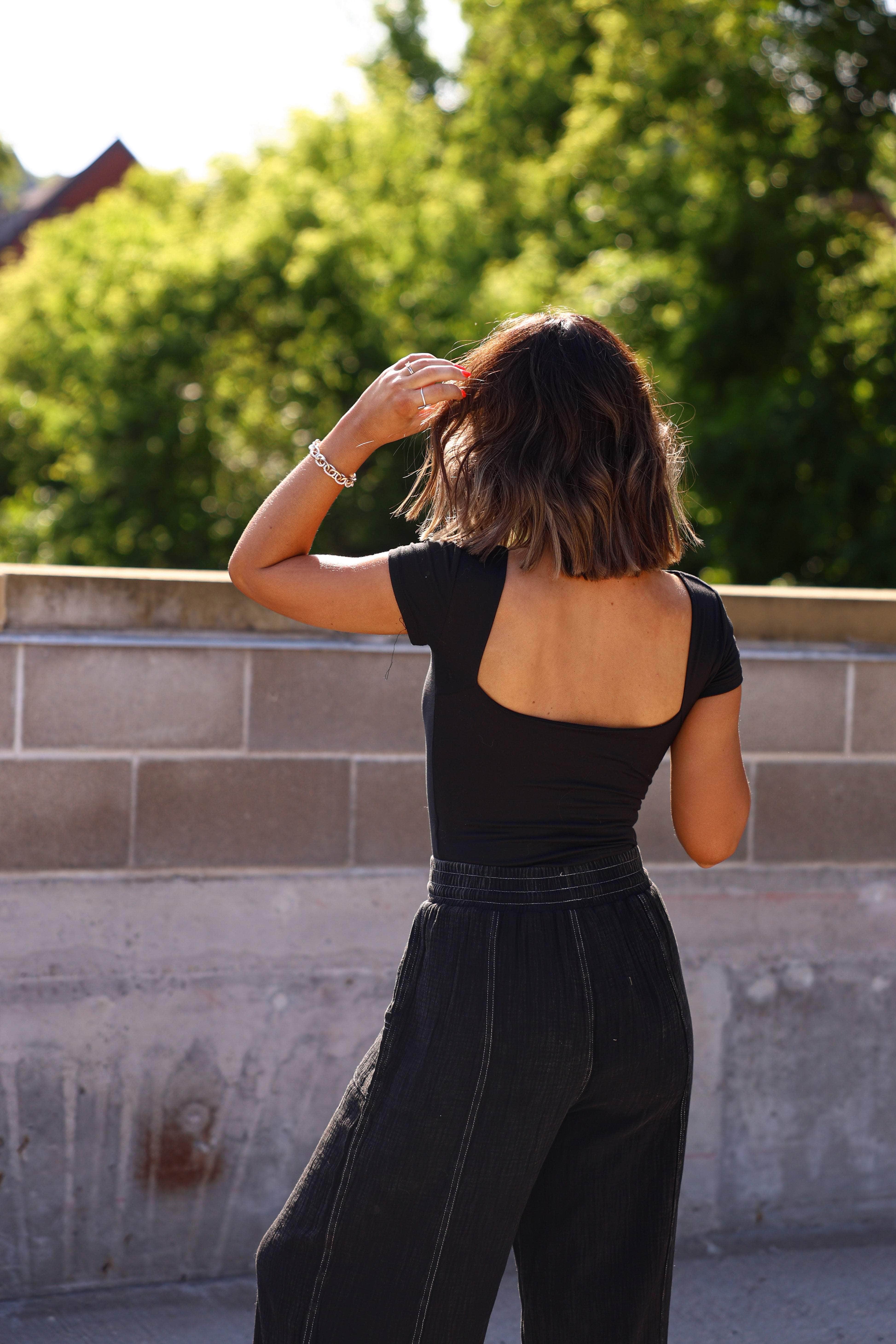 Elevate your look with this soft, stretchy top featuring a high neckline and a striking square open back design. It’s the perfect blend of modern edge and effortless comfort—great for day-to-night styling!