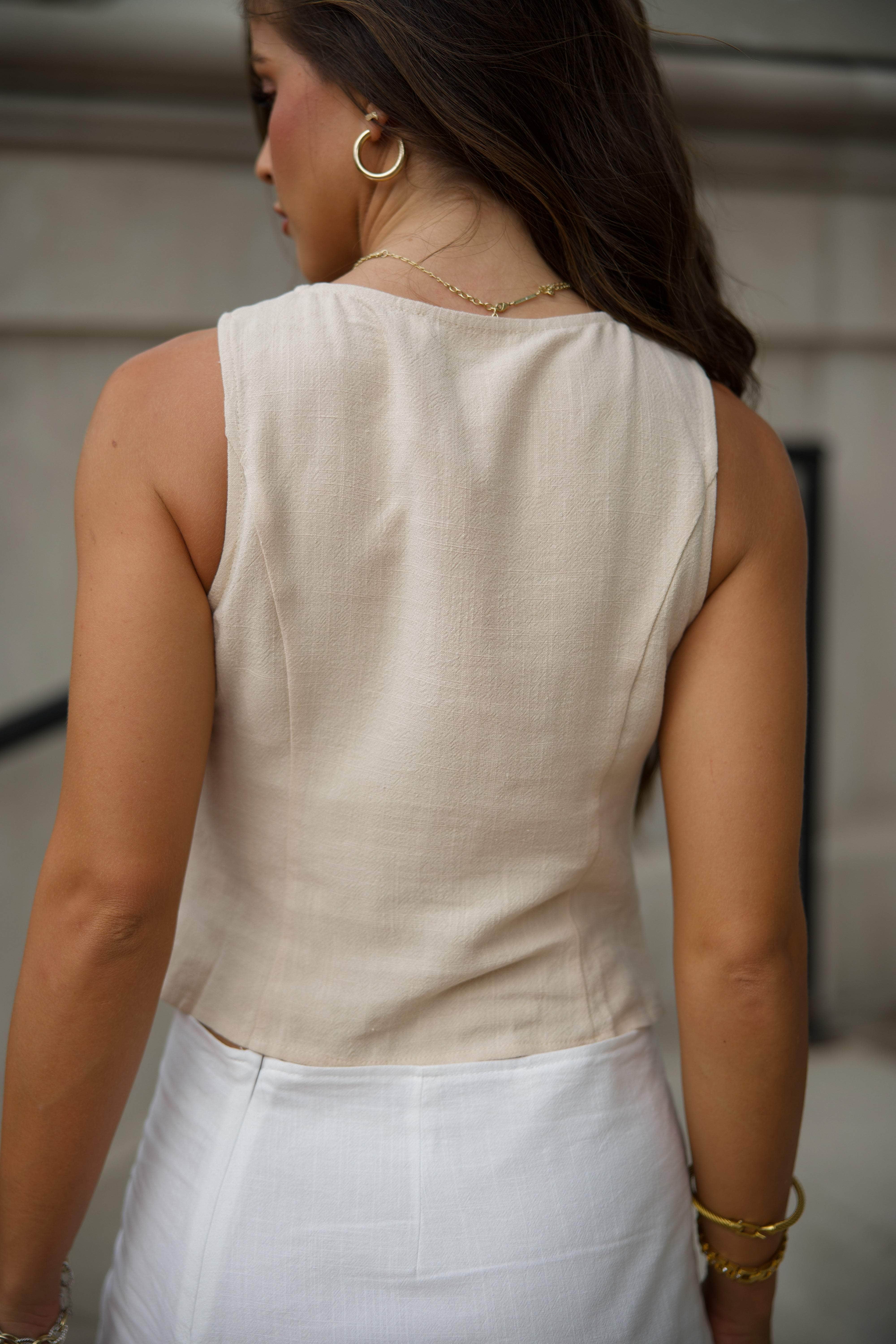 A modern twist on a classic silhouette. This vest top features iridescent button closures down the front, adding a subtle sheen and unique detail. Faux pocket accents complete the look with effortless style, making it a versatile piece for layering or wearing solo.