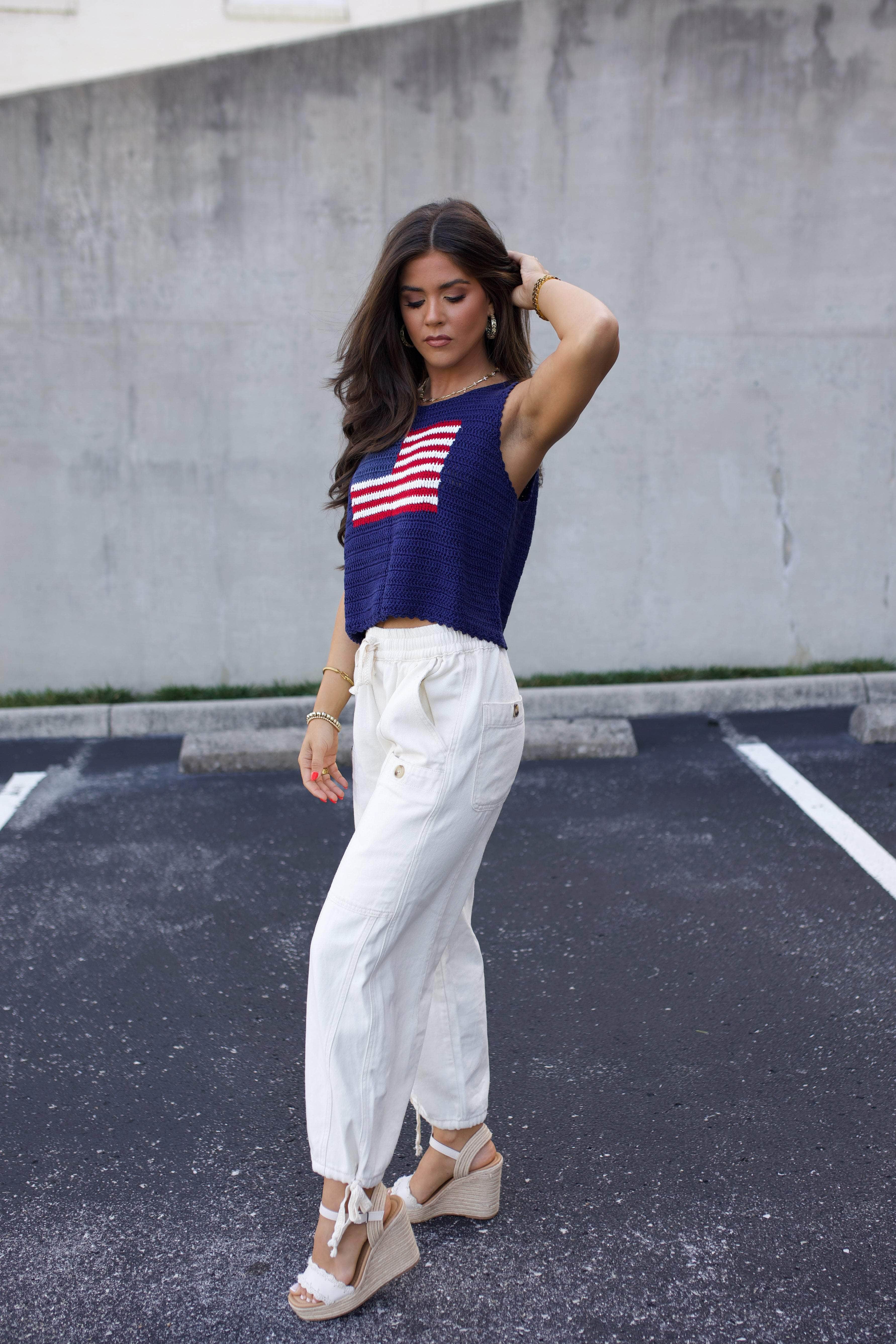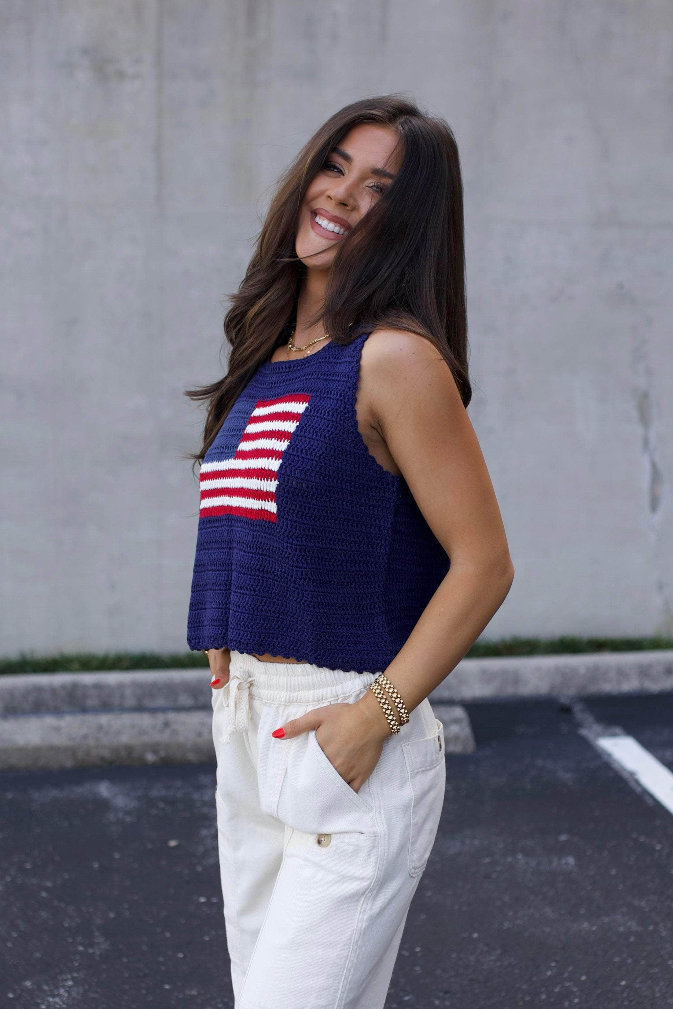 This navy loose knit cropped tank features a wide round neckline and an American flag graphic for a classic patriotic touch. Its relaxed fit makes it perfect for layering or wearing on warmer days.
